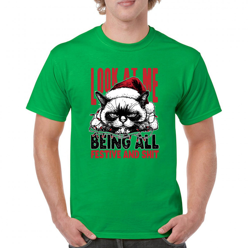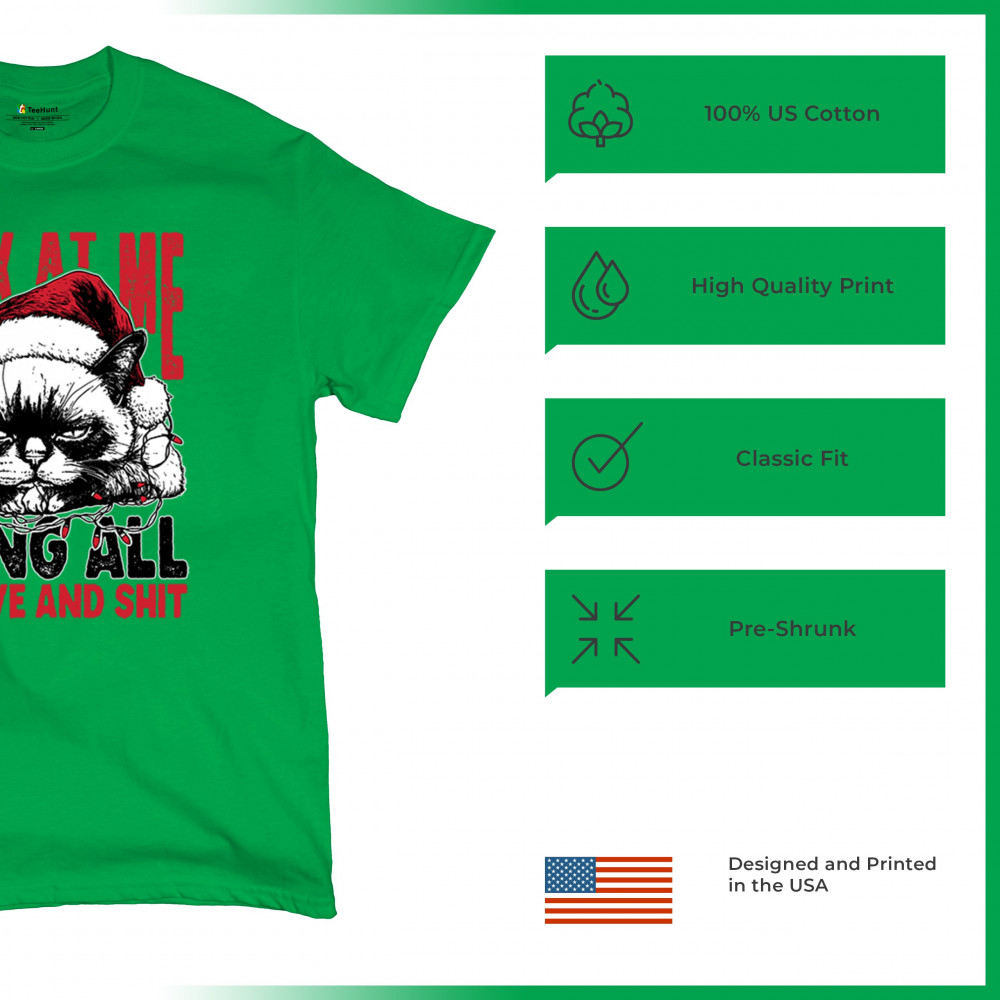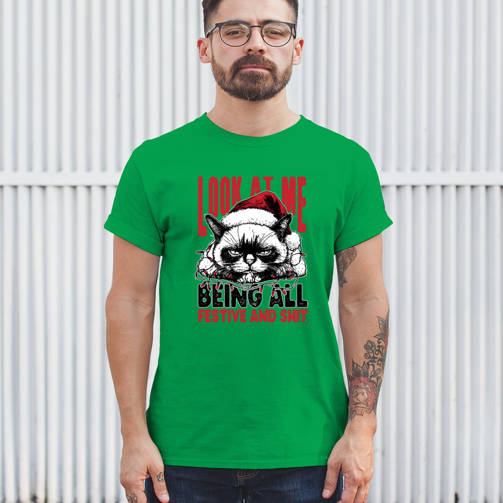 Grumpy Cat Christmas design with Santa hat, Christmas tree humor, Let It Snow vibes, Jingle Bells style, and sarcastic Merry Xmas spirit.