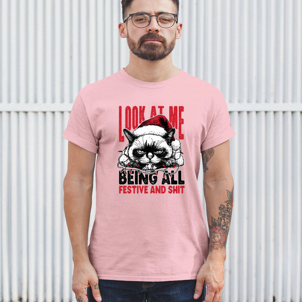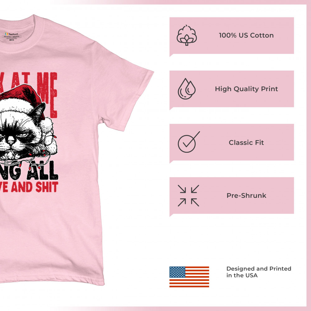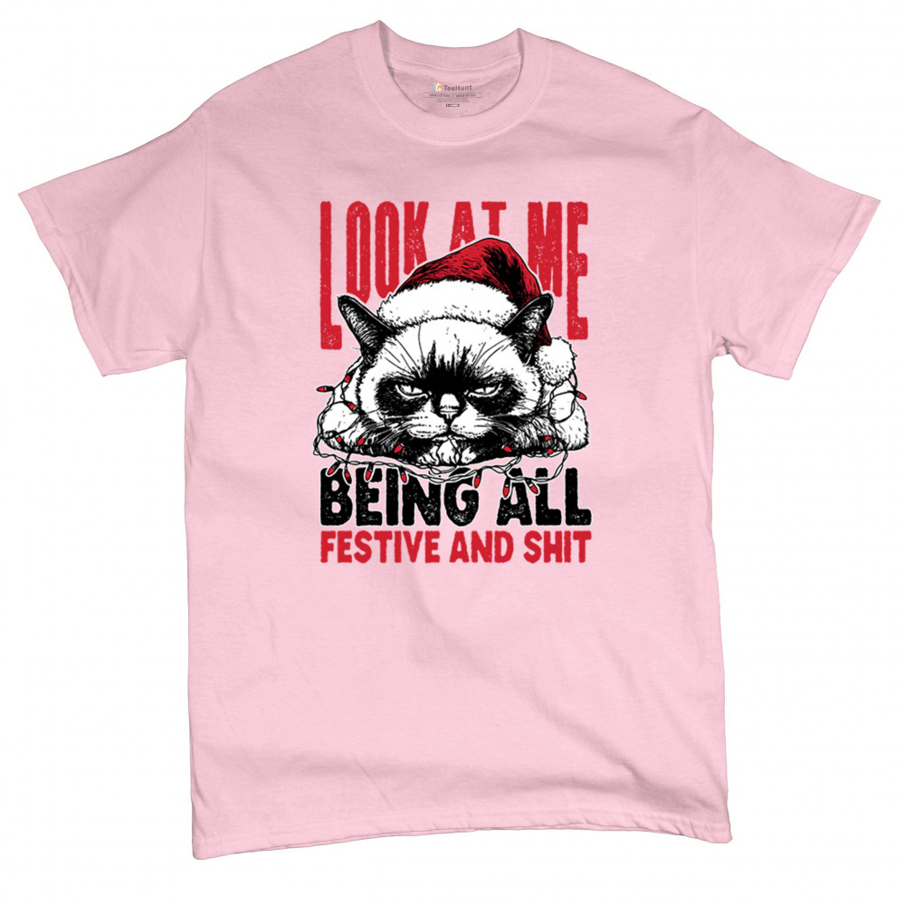 Grumpy Cat Christmas design with Santa hat, Christmas tree humor, Let It Snow vibes, Jingle Bells style, and sarcastic Merry Xmas spirit.