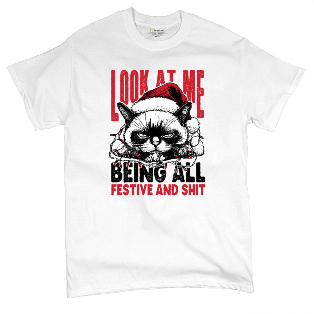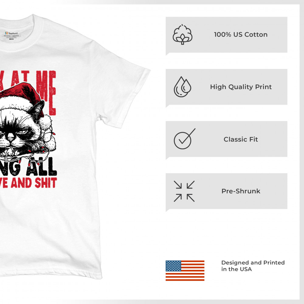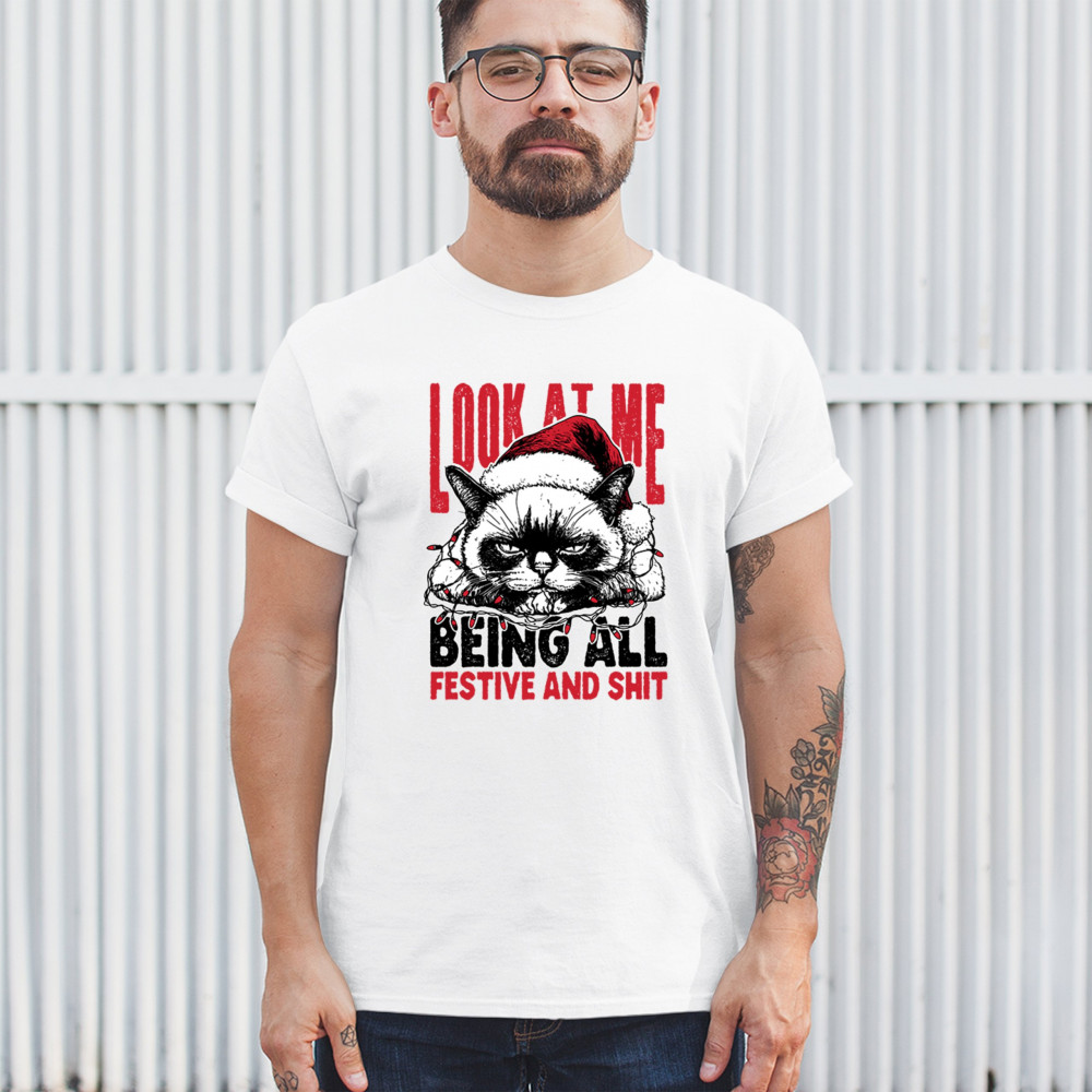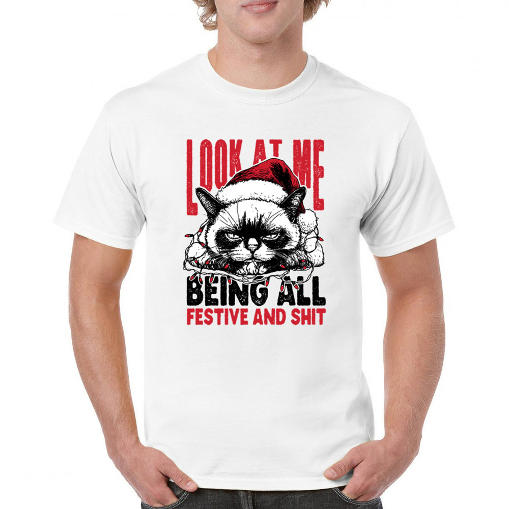 Grumpy Cat Christmas design with Santa hat, Christmas tree humor, Let It Snow vibes, Jingle Bells style, and sarcastic Merry Xmas spirit.