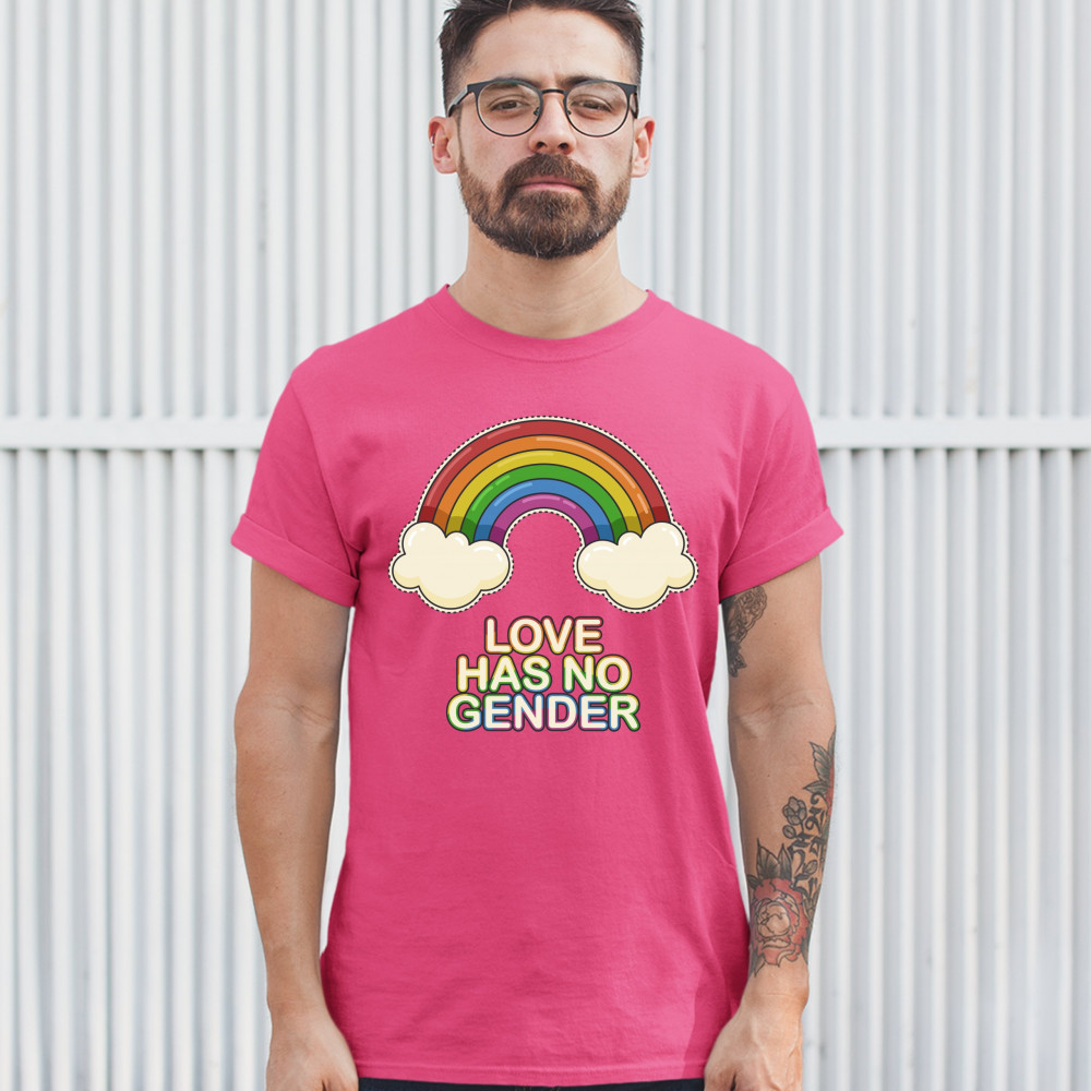 LOVE HAS NO GENDER t-shirt gay pride queer rainbow love is love men's tee hot pink