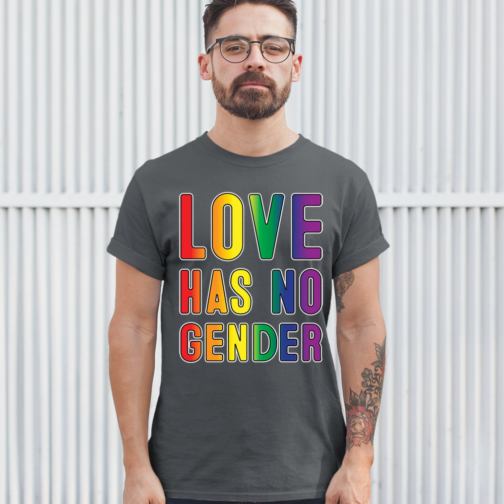 A print featuring a phrase: "Love Has No Gender" painted in rainbow colors. Great choice to wear as a proud queer person.