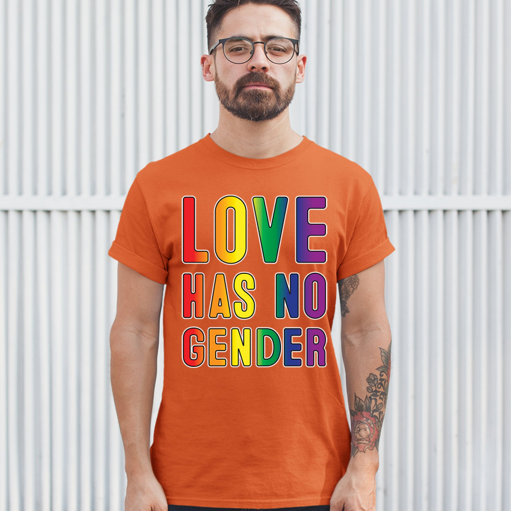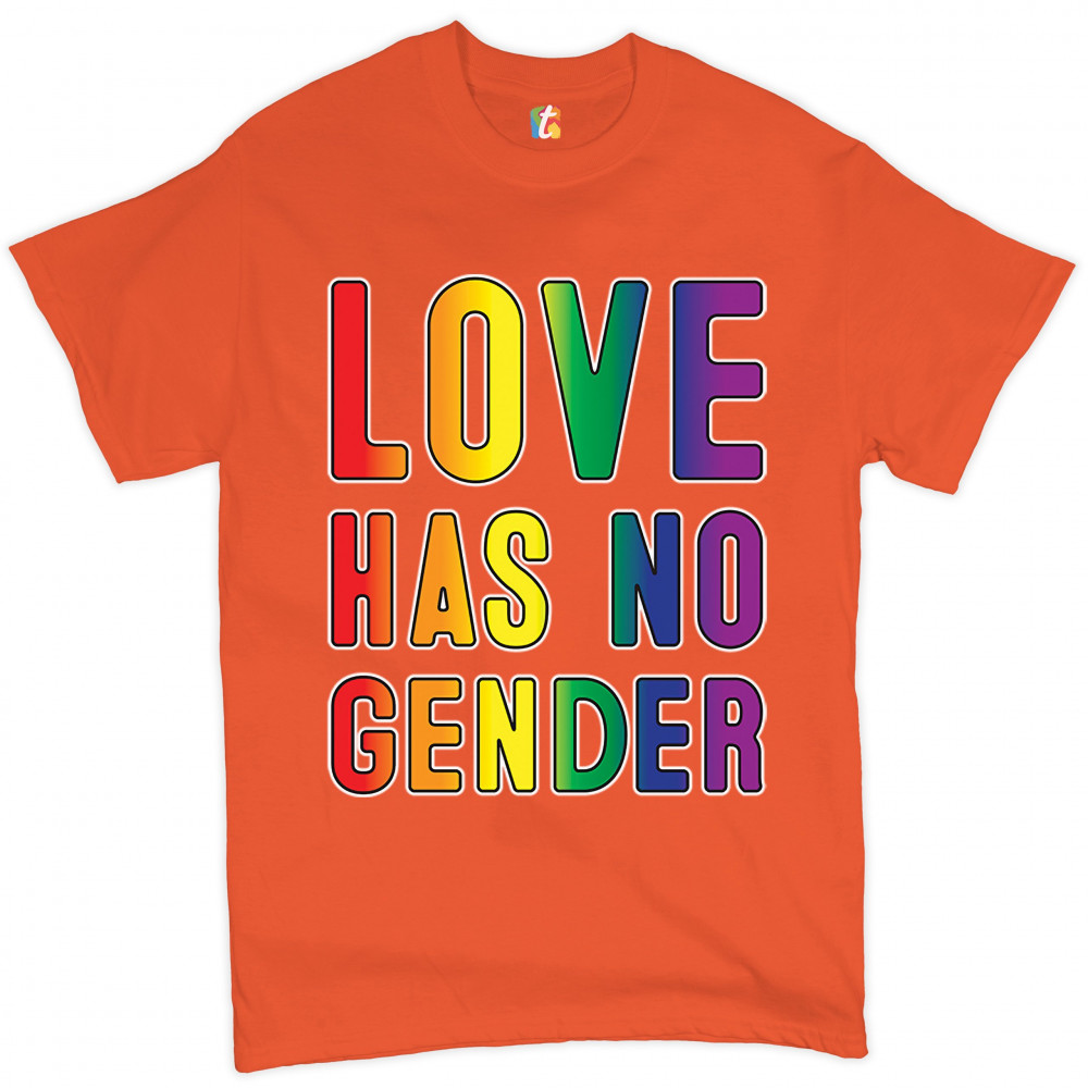 LOVE HAS NO GENDER t-shirt lesbian gay bi transgender queer ally men's tee orange