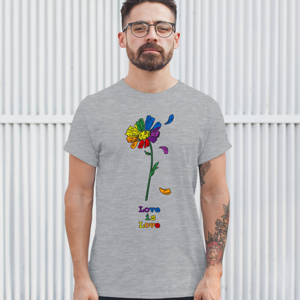 A print featuring a flower with leaves, painted in rainbow colors, falling off it. Below it it says: "Love Is Love". Great choice to wear as a proud queer person.