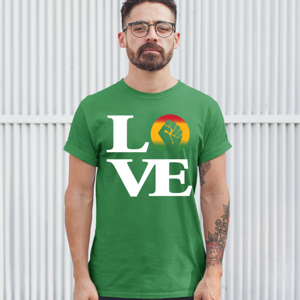 A political print depicting the word "Love" with a circle, painted in the Pan-African colors with a power fist inside of it, instead of the letter "o". Great choice to wear to spread an important message.