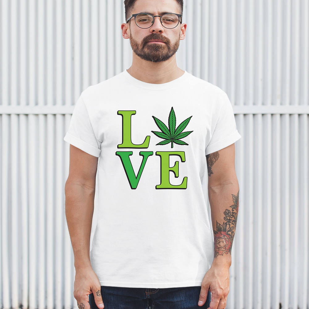 LOVE design with a bold weed leaf. Perfect for 420 fans, stoners, cannabis lifestyle wear, green pride, and marijuana lovers.