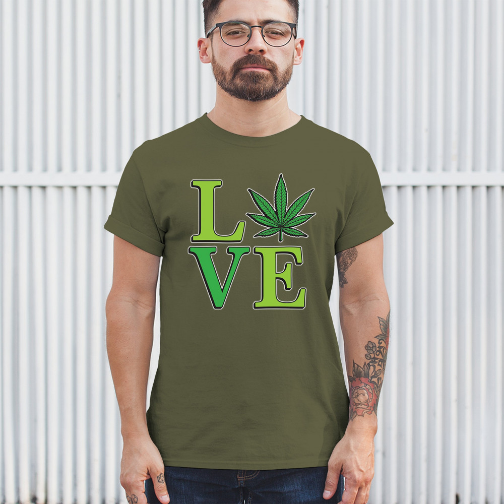 LOVE design with a bold weed leaf. Perfect for 420 fans, stoners, cannabis lifestyle wear, green pride, and marijuana lovers.