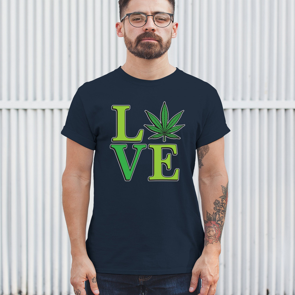 LOVE design with a bold weed leaf. Perfect for 420 fans, stoners, cannabis lifestyle wear, green pride, and marijuana lovers.