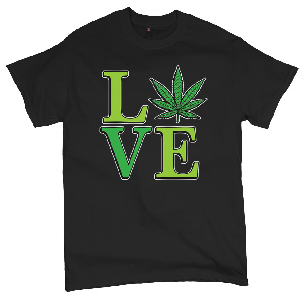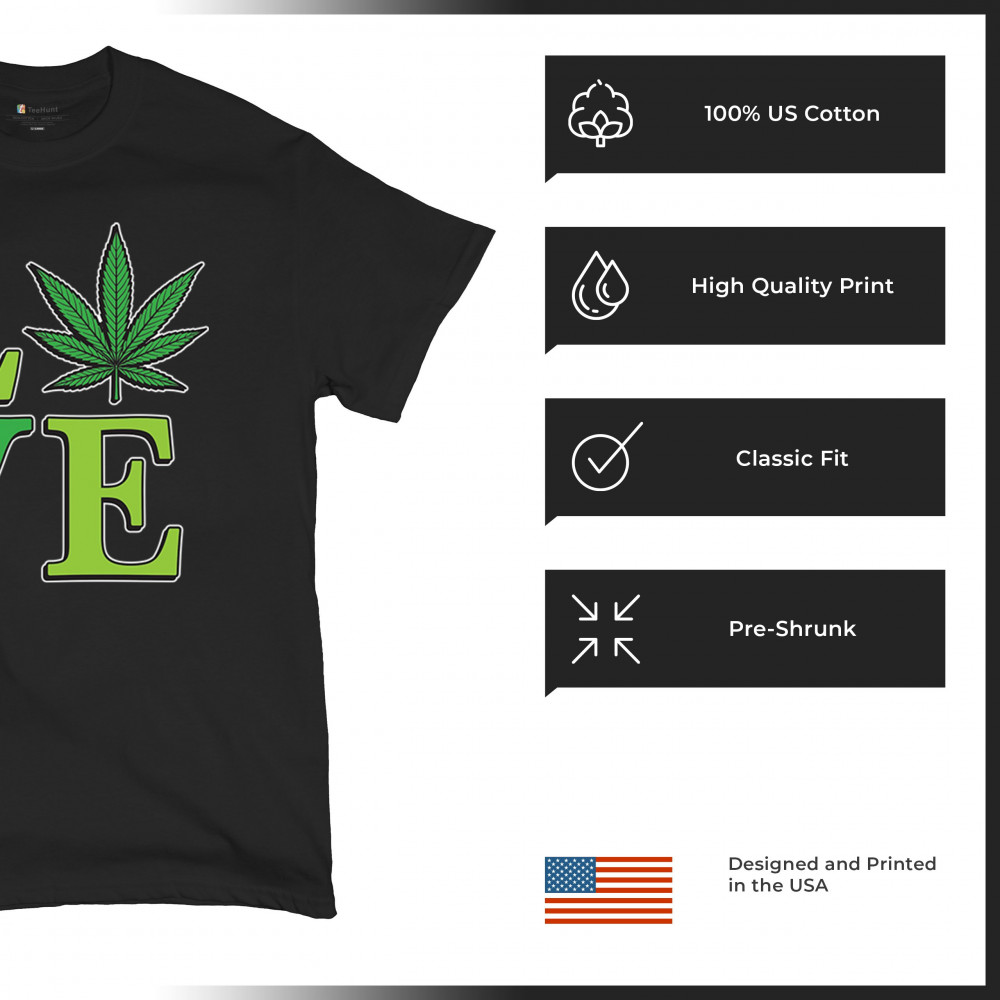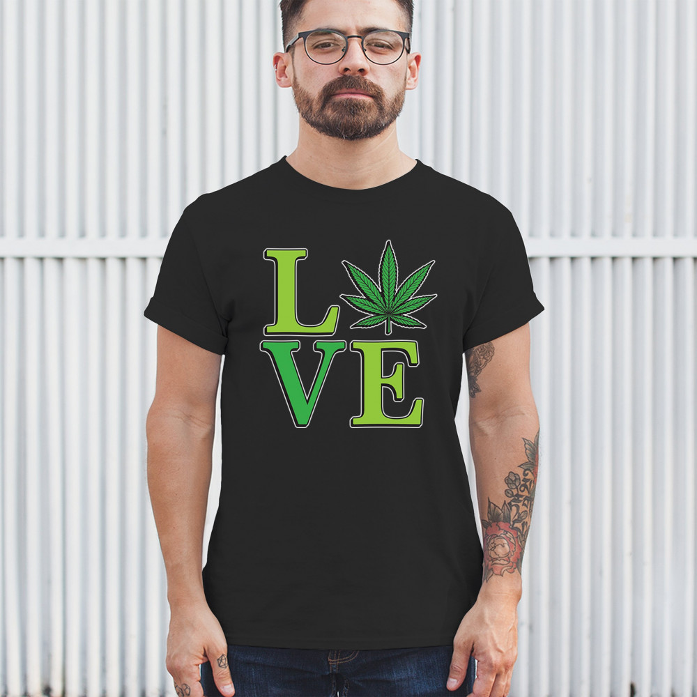 LOVE design with a bold weed leaf. Perfect for 420 fans, stoners, cannabis lifestyle wear, green pride, and marijuana lovers.