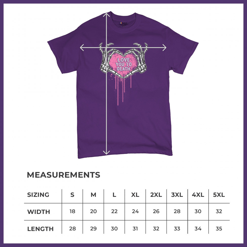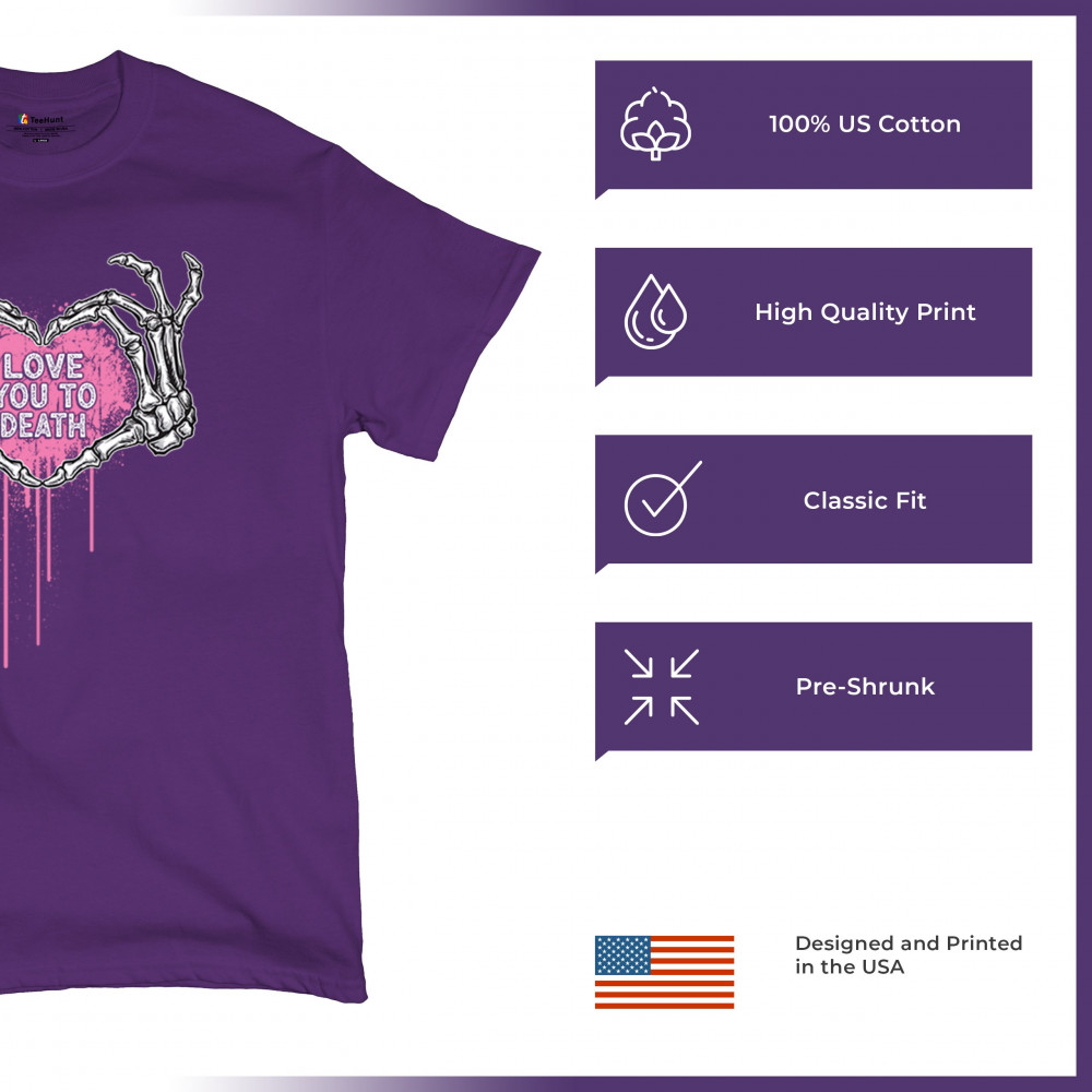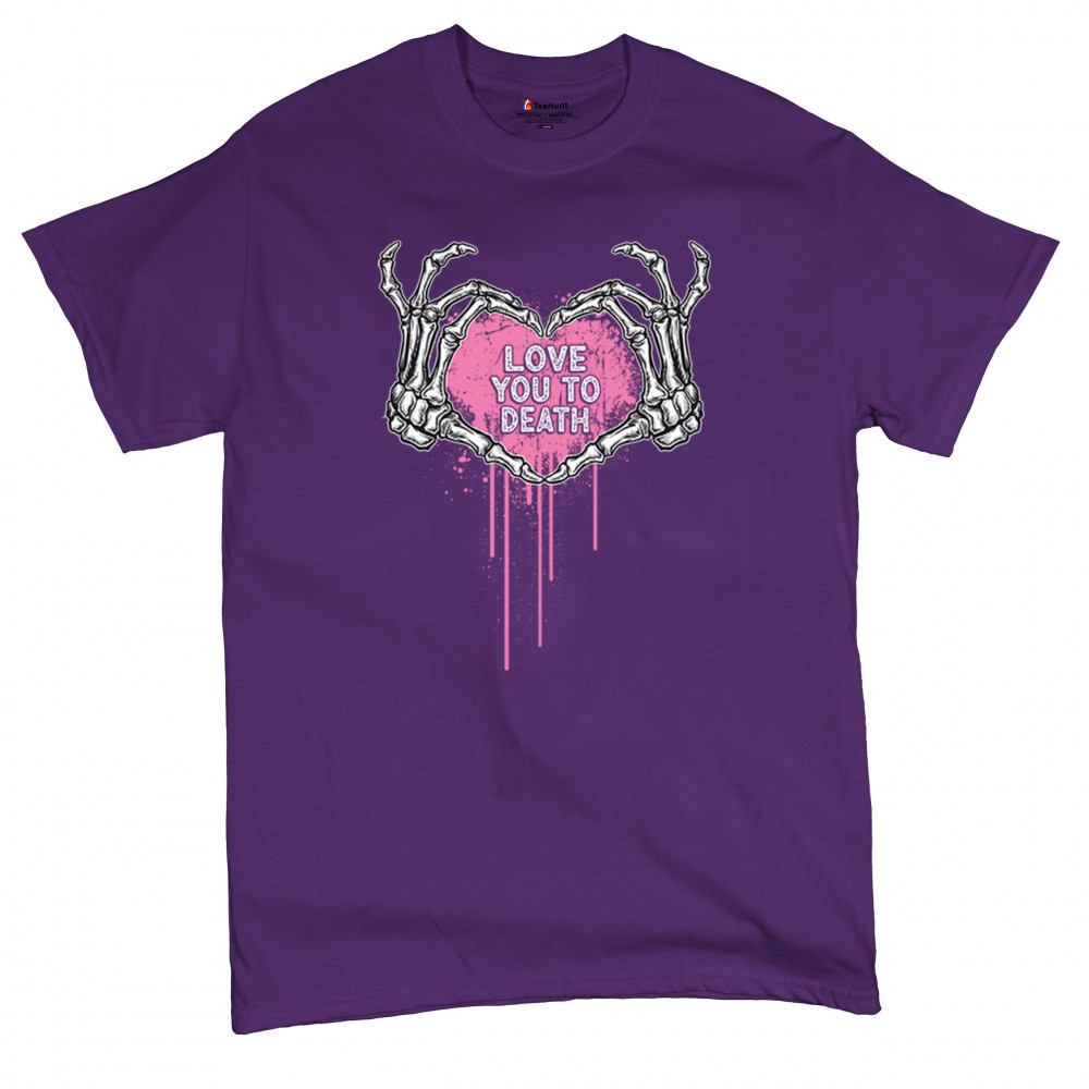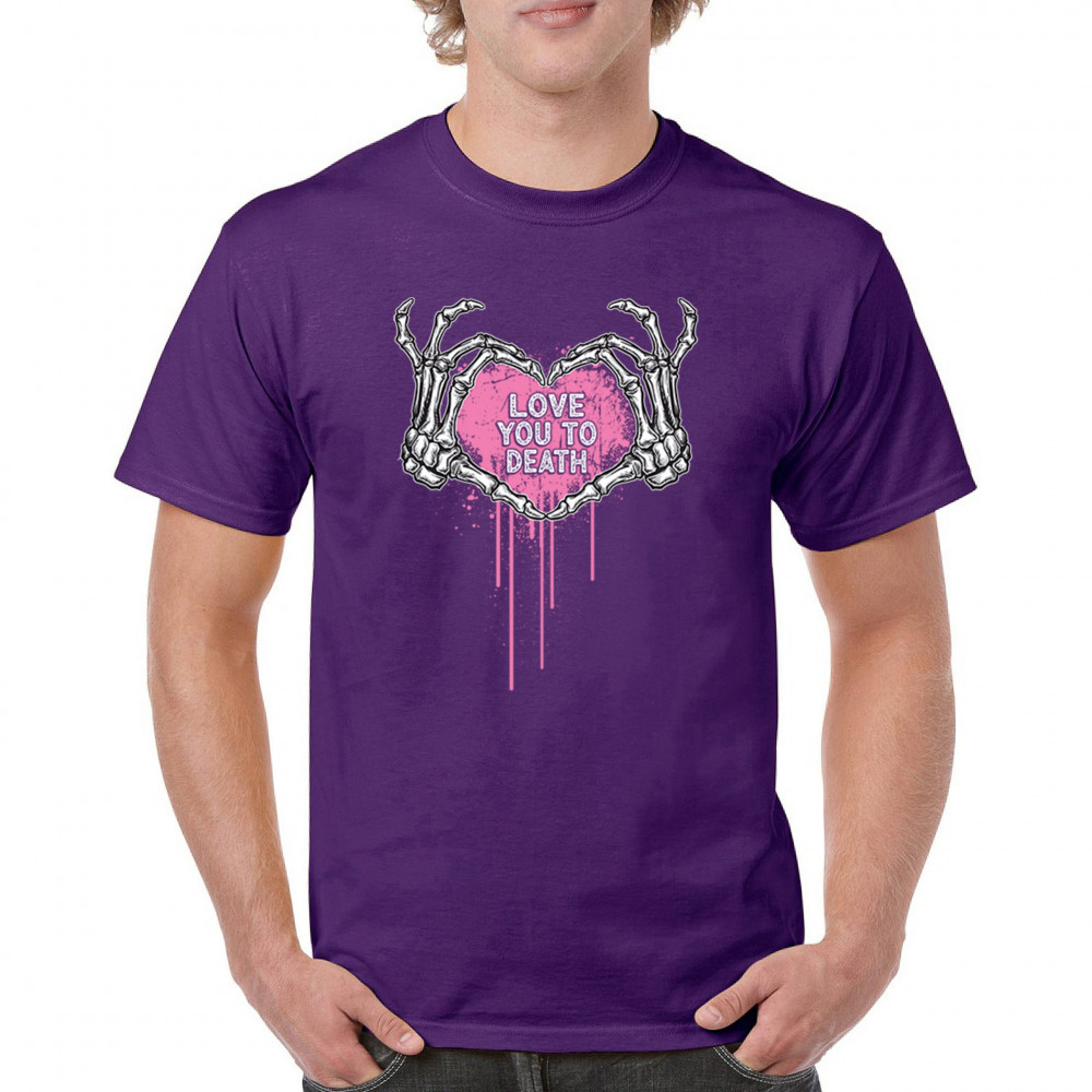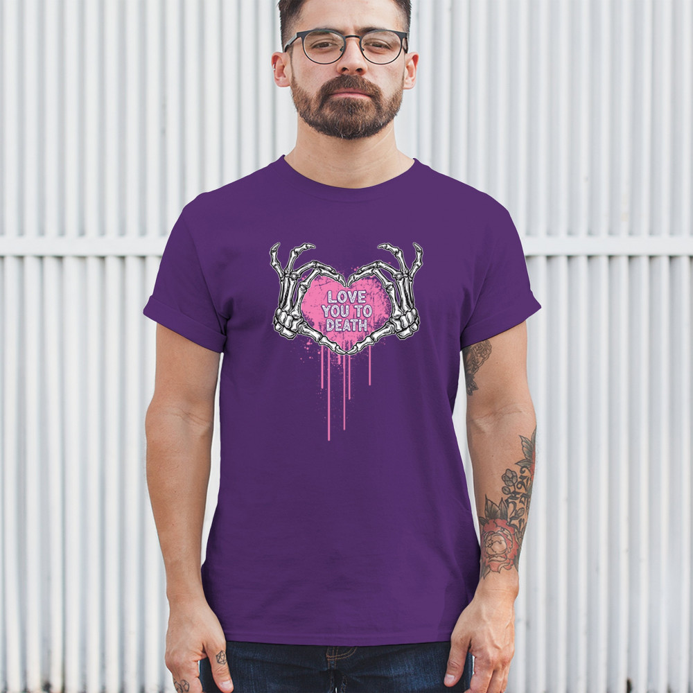 Show your spooky side with this skeleton hands heart design featuring a pink background and the phrase "Love You to Death." A perfect piece for alternative couples, Halloween lovers, and romantic rebels who embrace both affection and dark humor. Great for spooky season, date nights, and alt fashion outfits.
