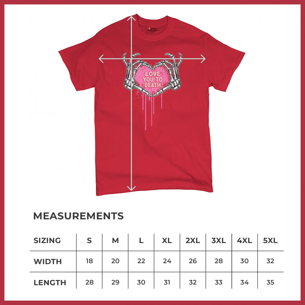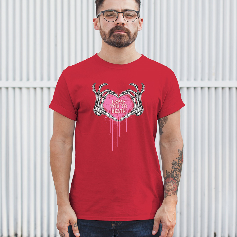Show your spooky side with this skeleton hands heart design featuring a pink background and the phrase "Love You to Death." A perfect piece for alternative couples, Halloween lovers, and romantic rebels who embrace both affection and dark humor. Great for spooky season, date nights, and alt fashion outfits.