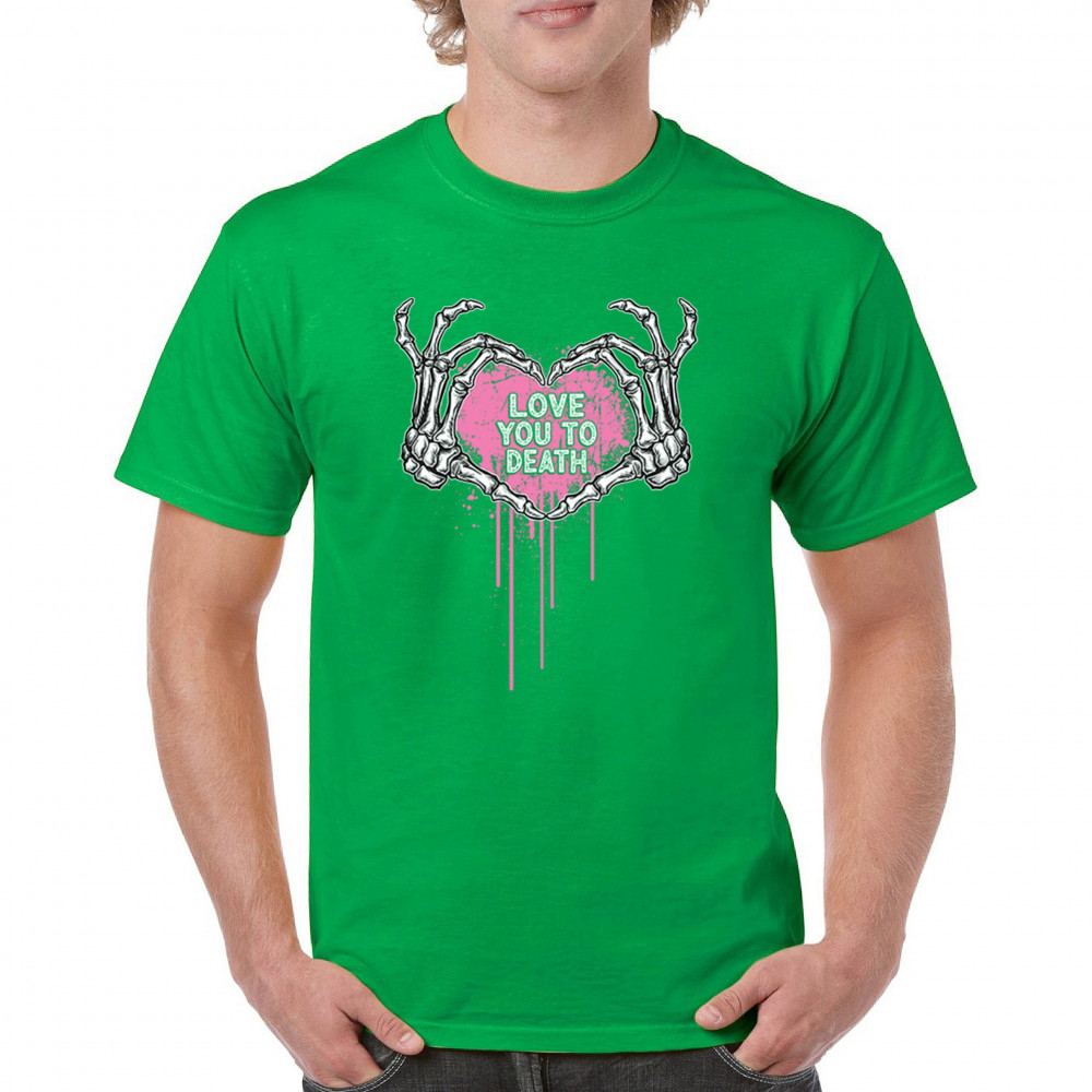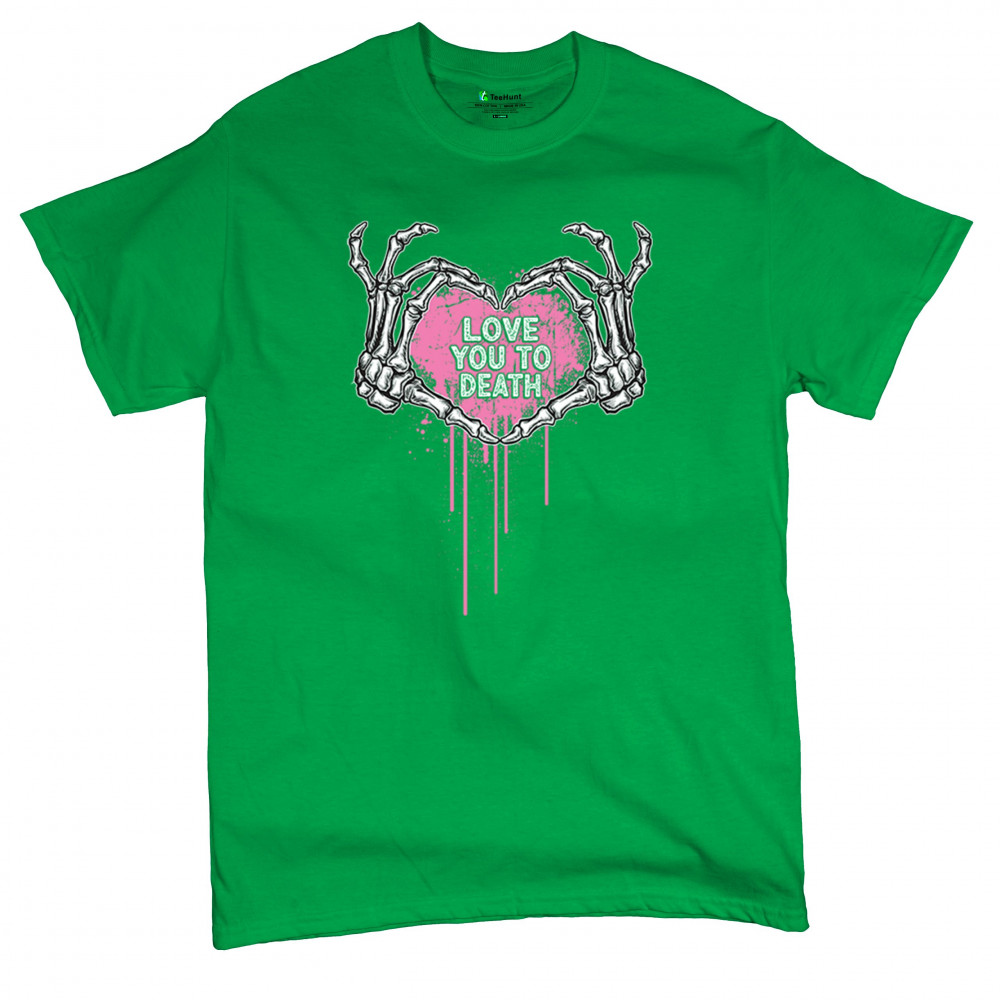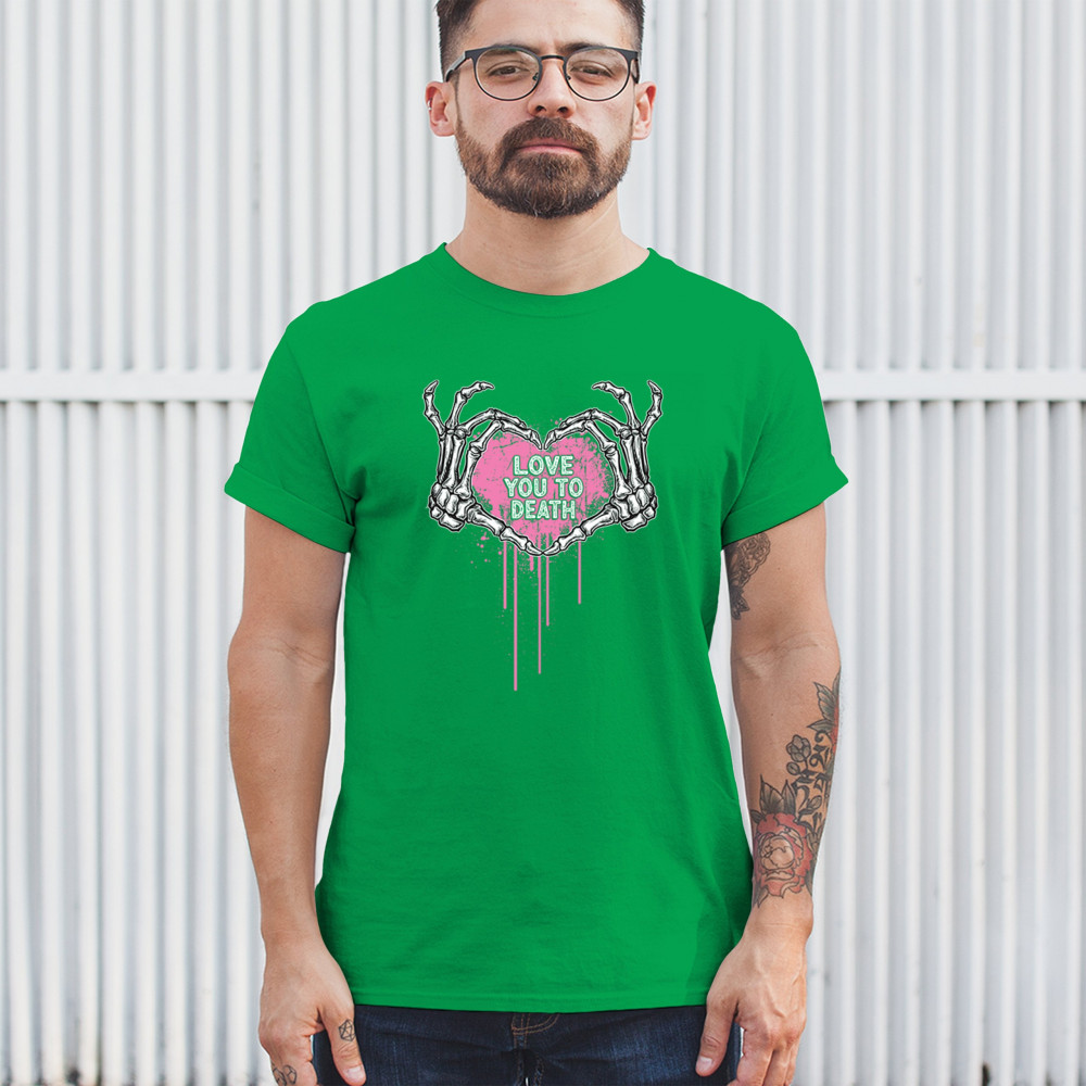 Show your spooky side with this skeleton hands heart design featuring a pink background and the phrase "Love You to Death." A perfect piece for alternative couples, Halloween lovers, and romantic rebels who embrace both affection and dark humor. Great for spooky season, date nights, and alt fashion outfits.