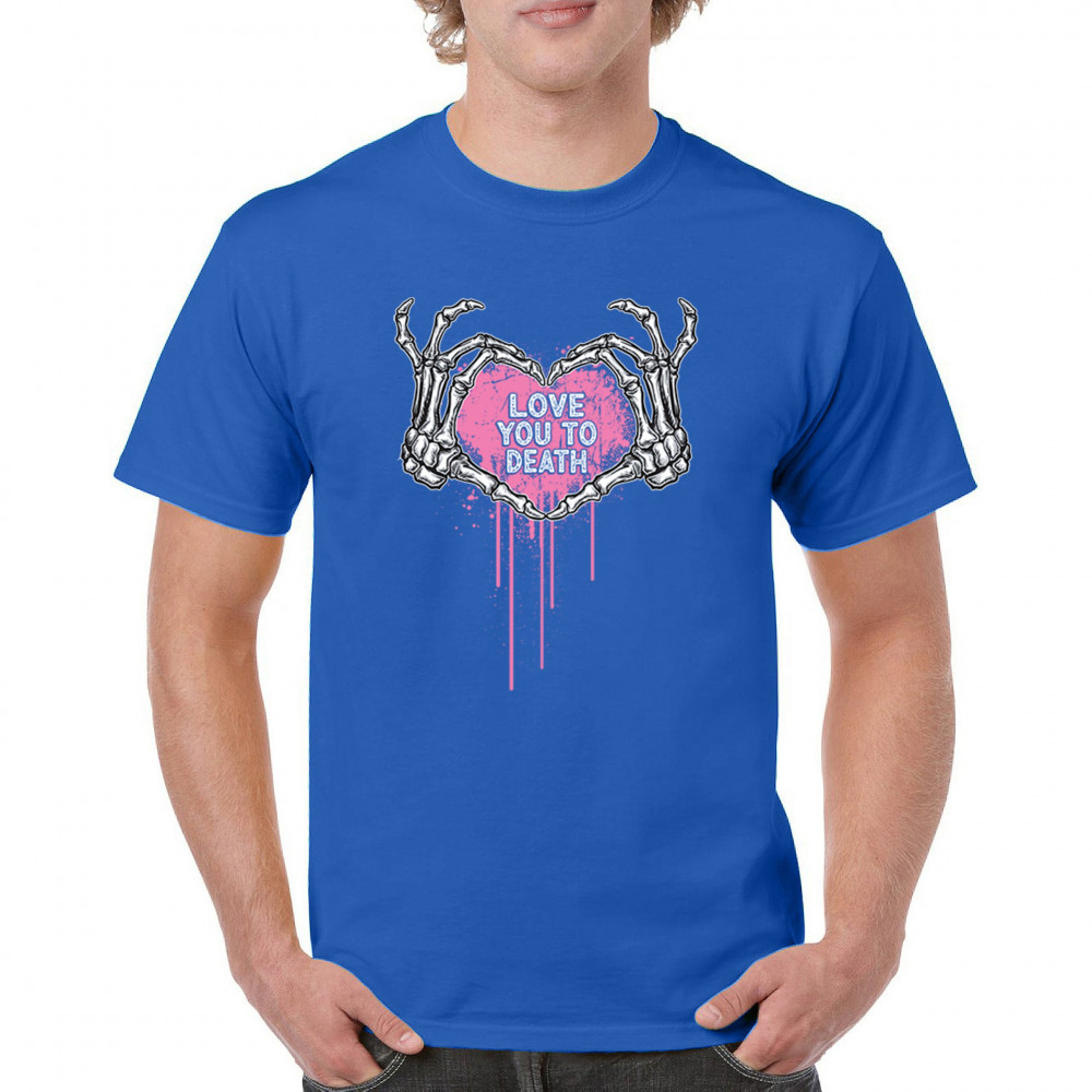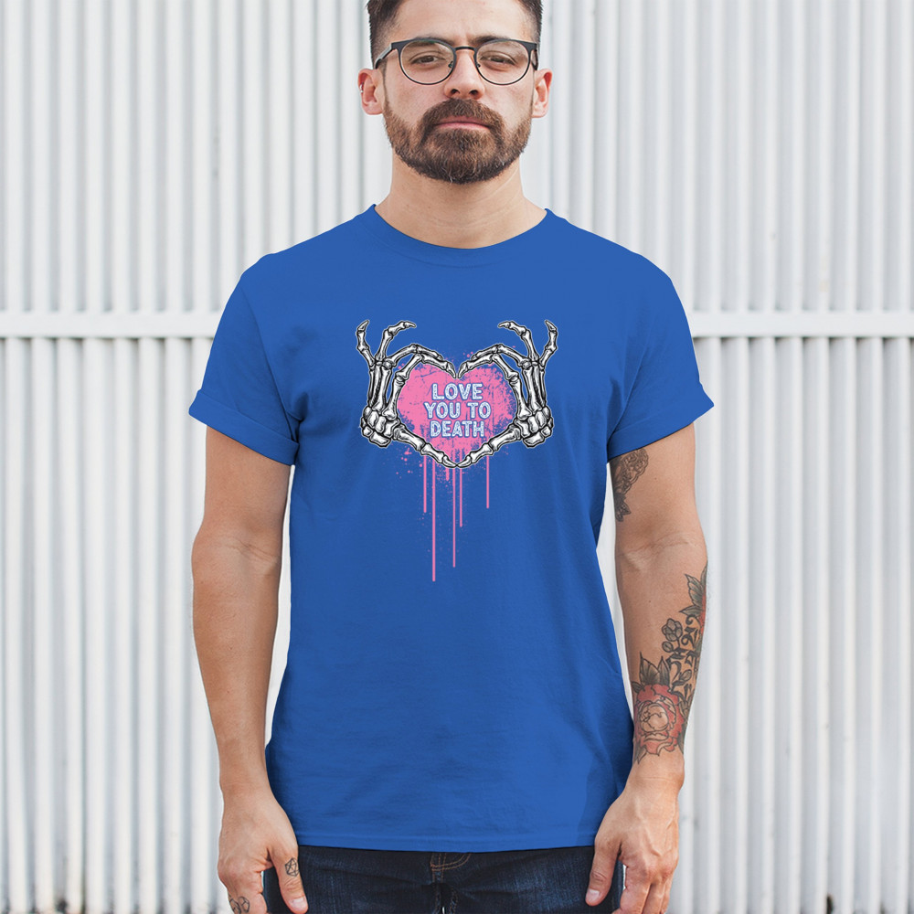 Show your spooky side with this skeleton hands heart design featuring a pink background and the phrase "Love You to Death." A perfect piece for alternative couples, Halloween lovers, and romantic rebels who embrace both affection and dark humor. Great for spooky season, date nights, and alt fashion outfits.