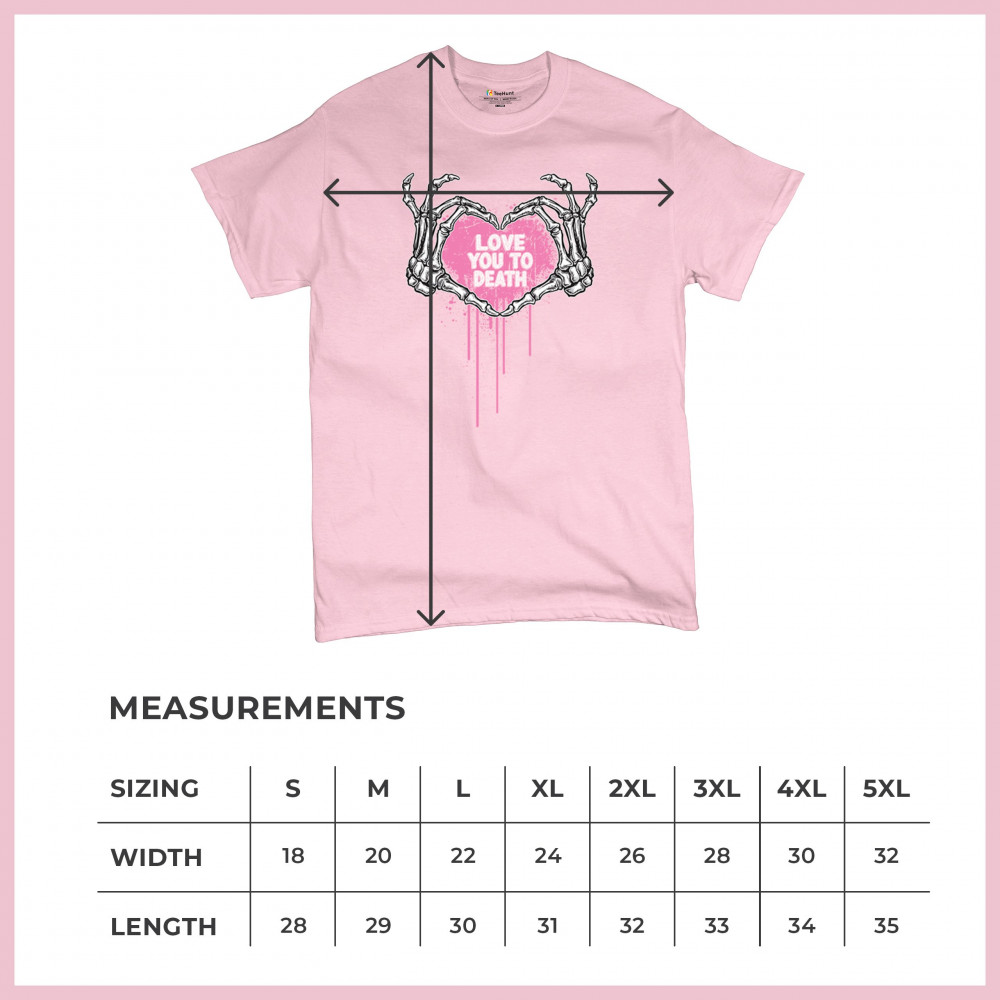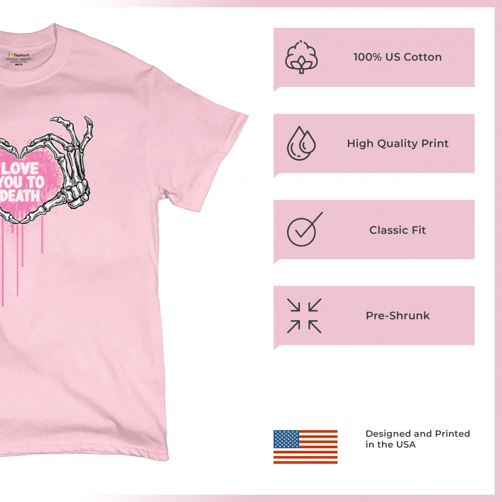 Show your spooky side with this skeleton hands heart design featuring a pink background and the phrase "Love You to Death." A perfect piece for alternative couples, Halloween lovers, and romantic rebels who embrace both affection and dark humor. Great for spooky season, date nights, and alt fashion outfits.