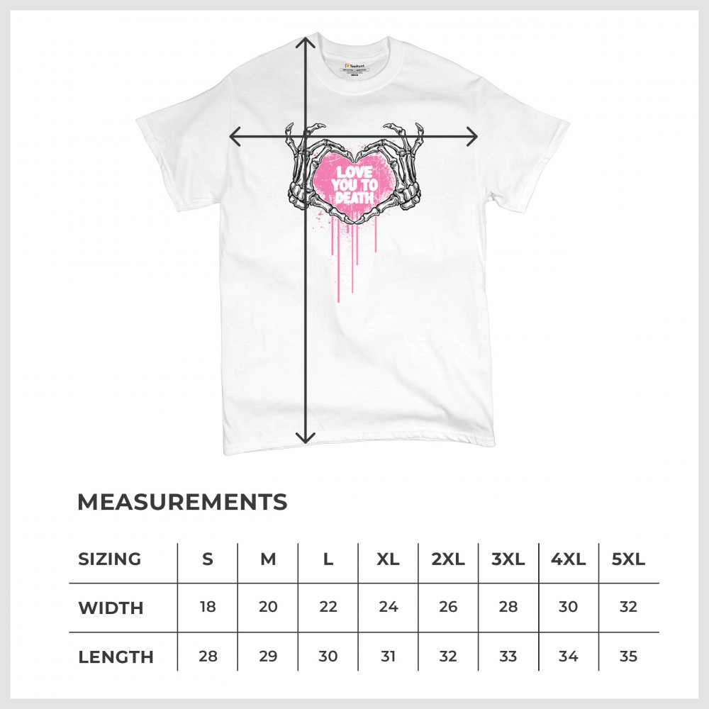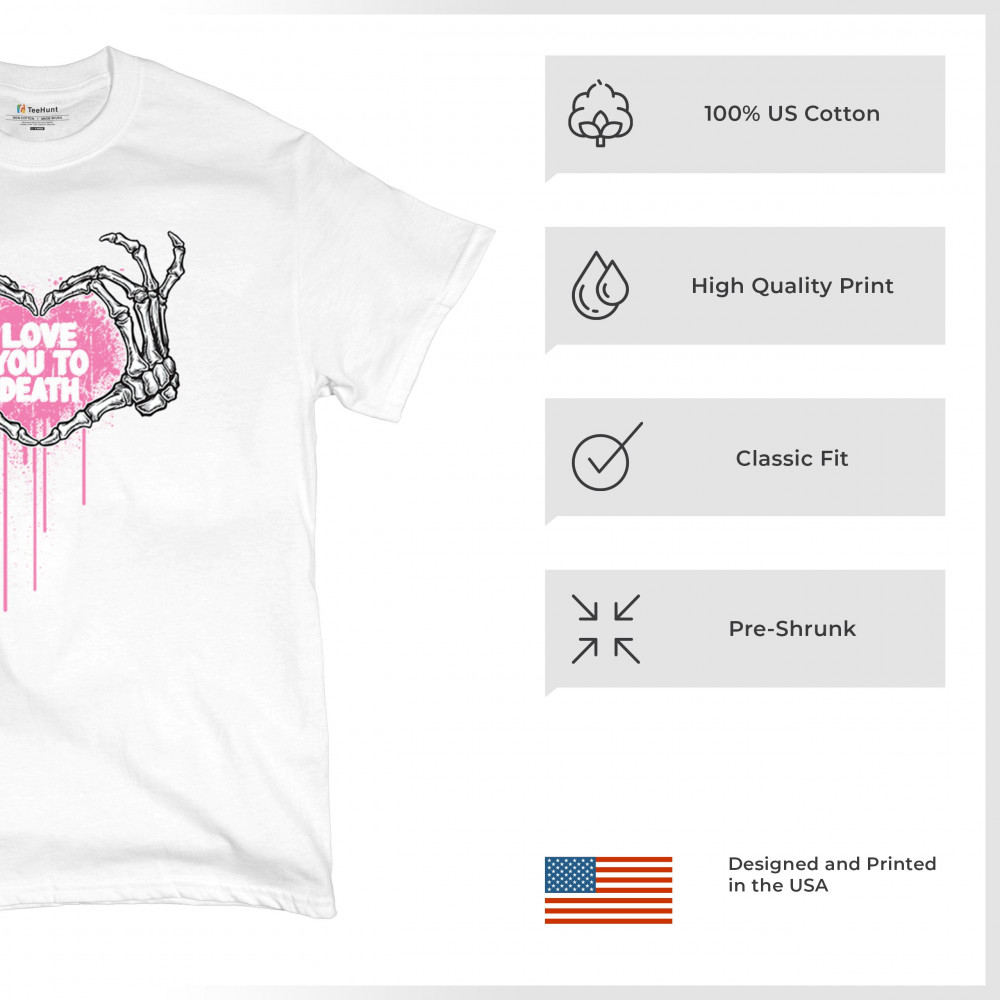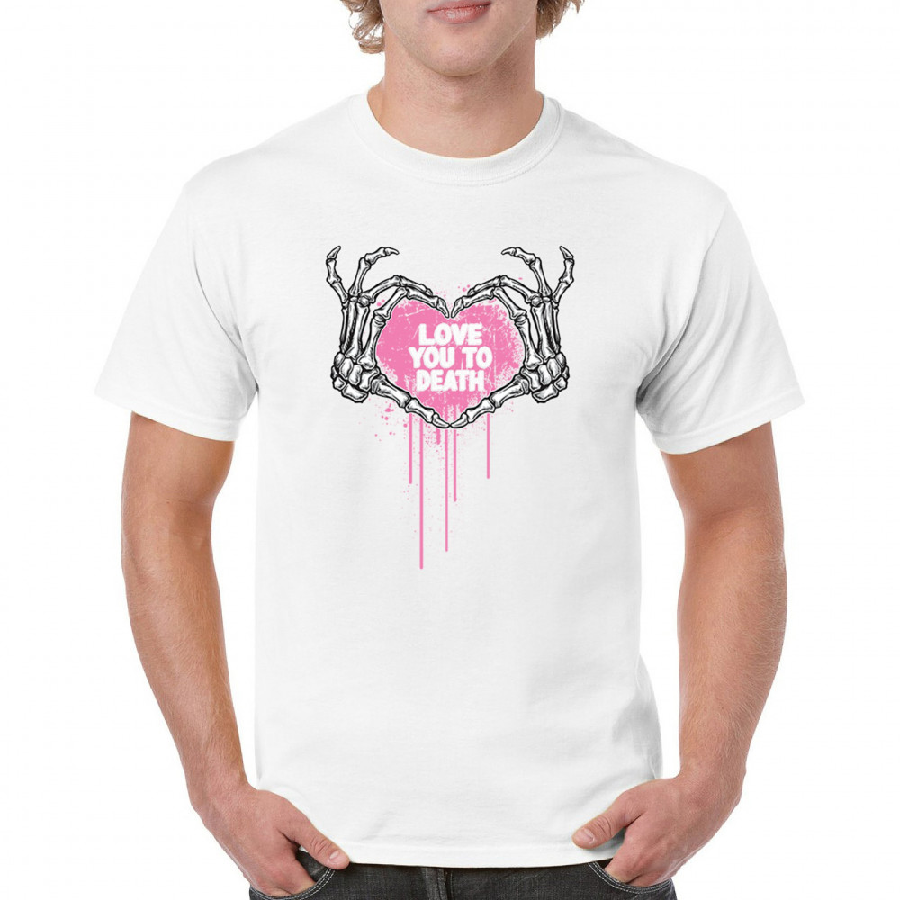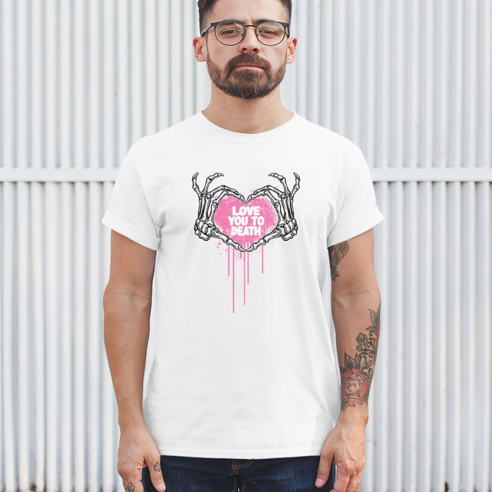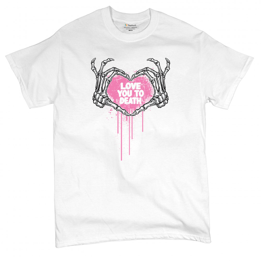 Show your spooky side with this skeleton hands heart design featuring a pink background and the phrase "Love You to Death." A perfect piece for alternative couples, Halloween lovers, and romantic rebels who embrace both affection and dark humor. Great for spooky season, date nights, and alt fashion outfits.