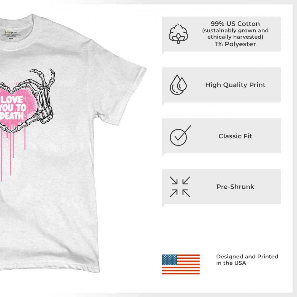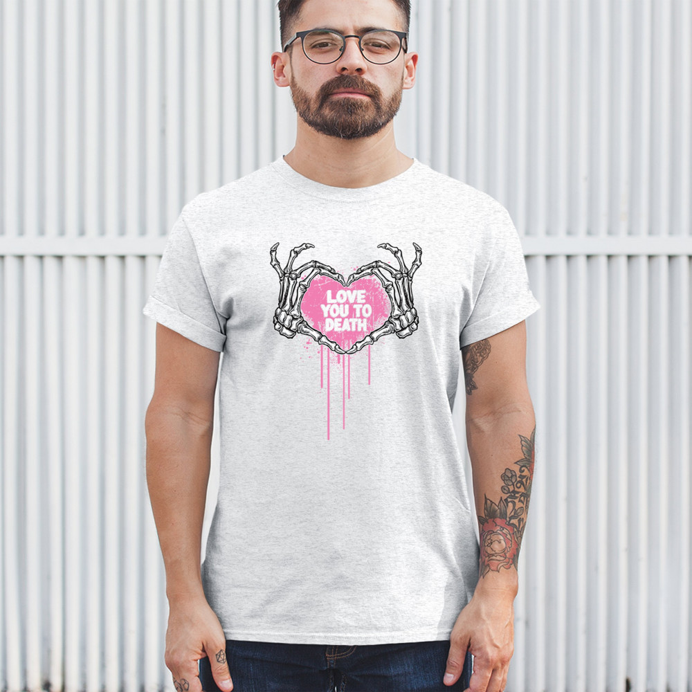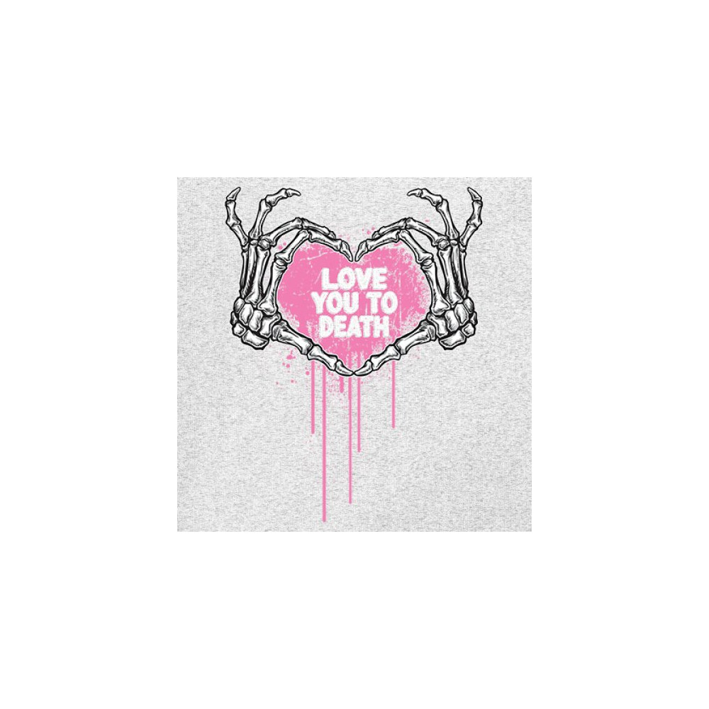 Show your spooky side with this skeleton hands heart design featuring a pink background and the phrase "Love You to Death." A perfect piece for alternative couples, Halloween lovers, and romantic rebels who embrace both affection and dark humor. Great for spooky season, date nights, and alt fashion outfits.