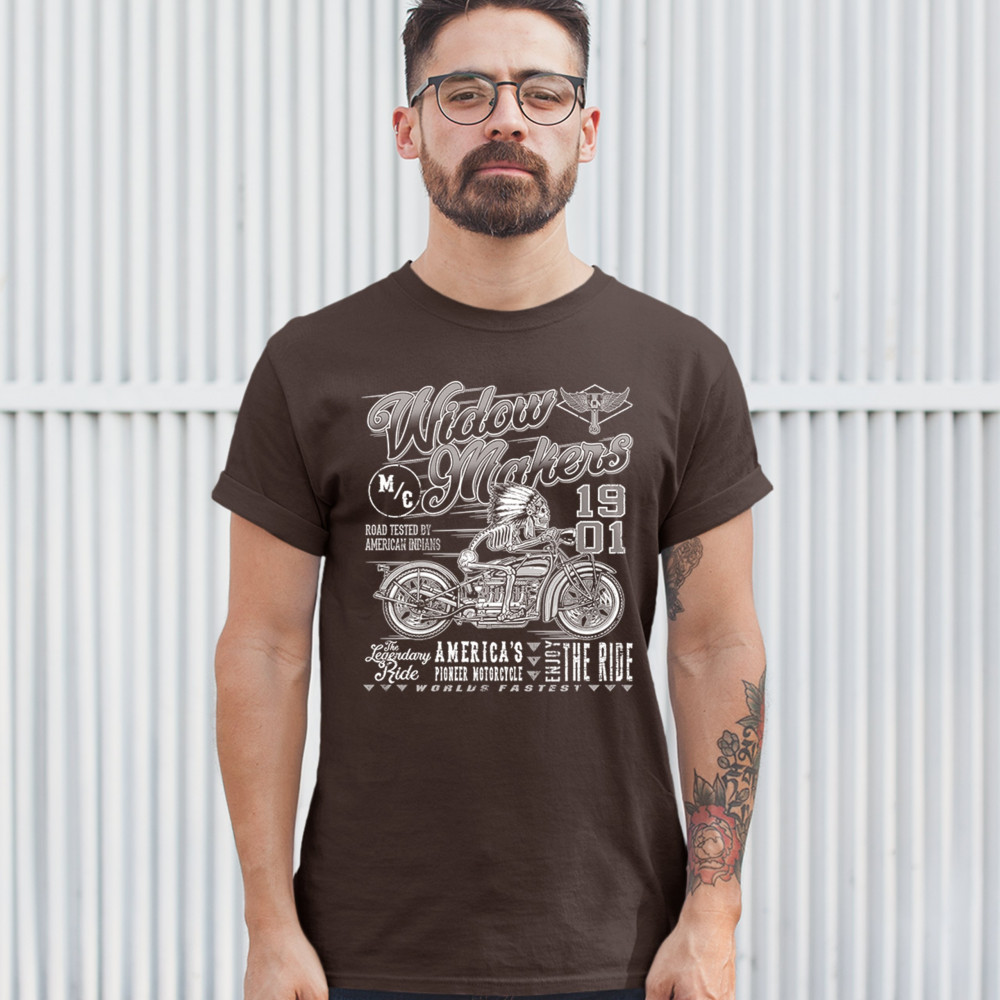 A print featuring a skeleton wearing a native American warbonnet and riding a bobber motorcycle. There is also a logo with a winged piston in the top right corner. The print says: "M/C Widowmakers 1901, road tested by American Indians, the legendary ride,