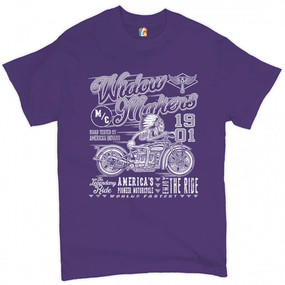 A print featuring a skeleton wearing a native American warbonnet and riding a bobber motorcycle. There is also a logo with a winged piston in the top right corner. The print says: "M/C Widowmakers 1901, road tested by American Indians, the legendary ride,