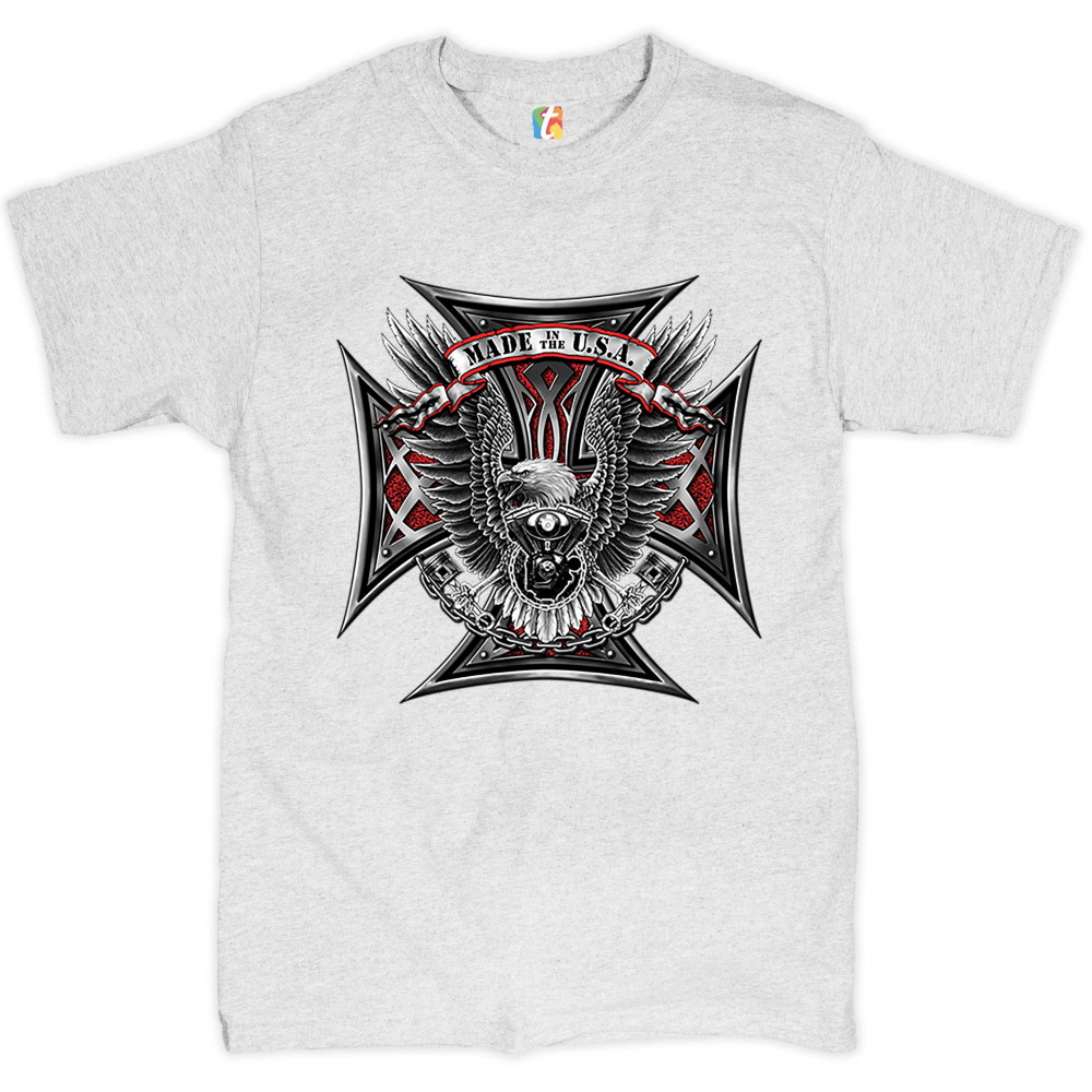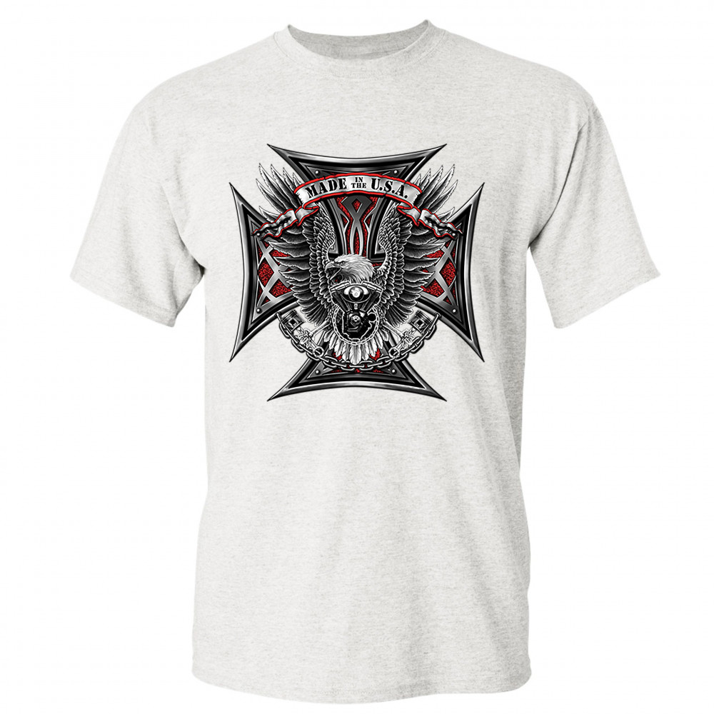 A print featuring a huge cross. In the front there is a bald eagle spreading it's wings and holding pistons in it's talons. In front of it's chest there is a V engine. At the top there is a stripe with "Made in the USA" written on it. A great choice for a