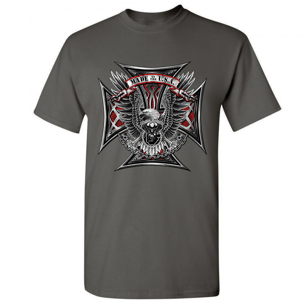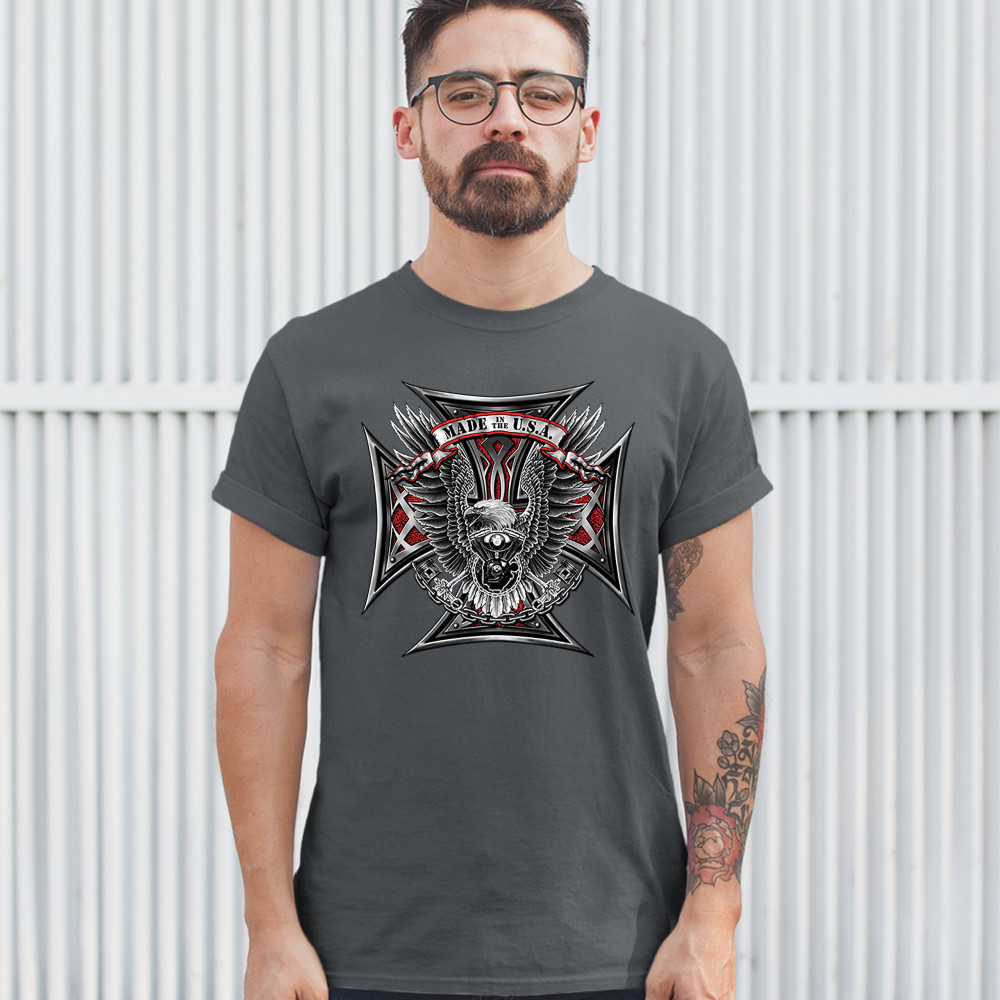 A print featuring a huge cross. In the front there is a bald eagle spreading it's wings and holding pistons in it's talons. In front of it's chest there is a V engine. At the top there is a stripe with "Made in the USA" written on it. A great choice for a