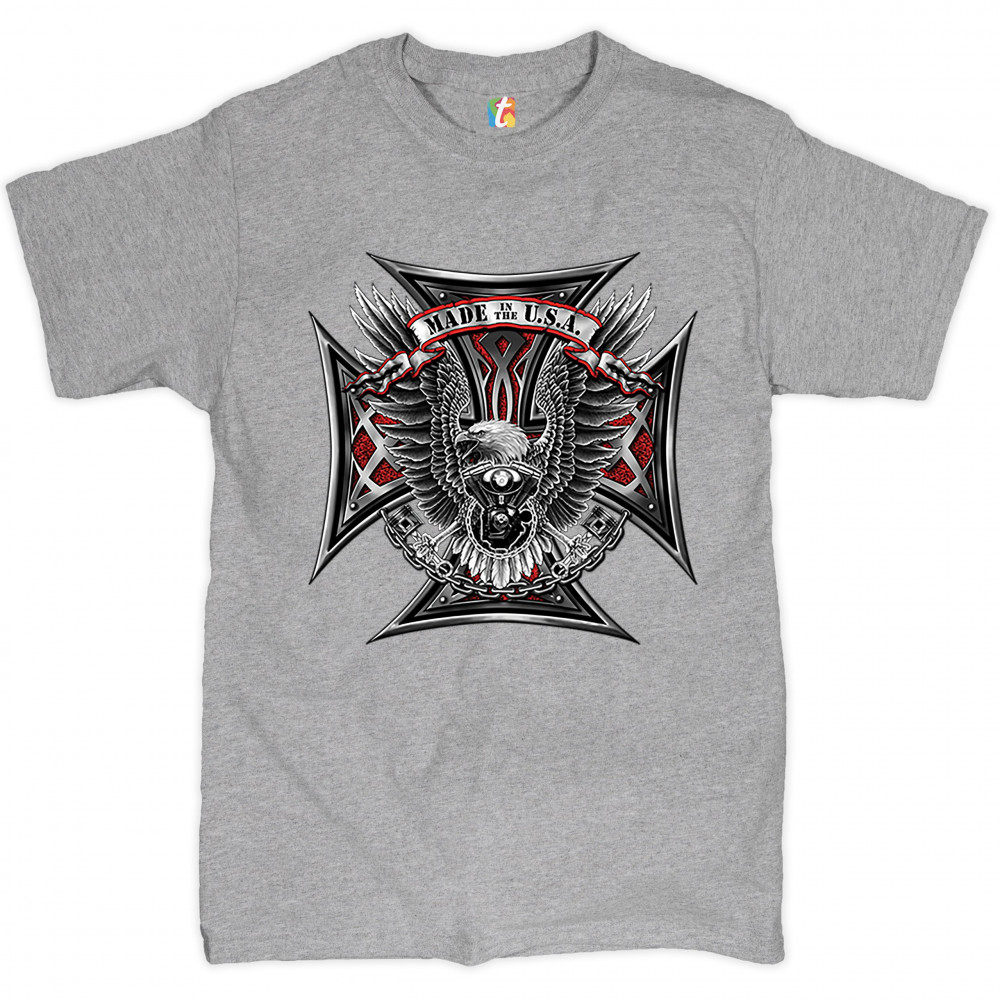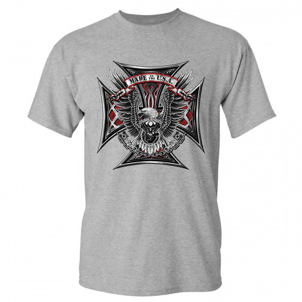 A print featuring a huge cross. In the front there is a bald eagle spreading it's wings and holding pistons in it's talons. In front of it's chest there is a V engine. At the top there is a stripe with "Made in the USA" written on it. A great choice for a
