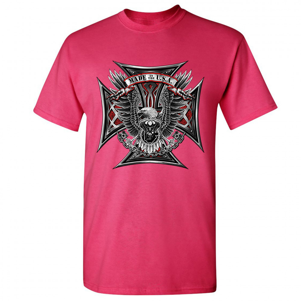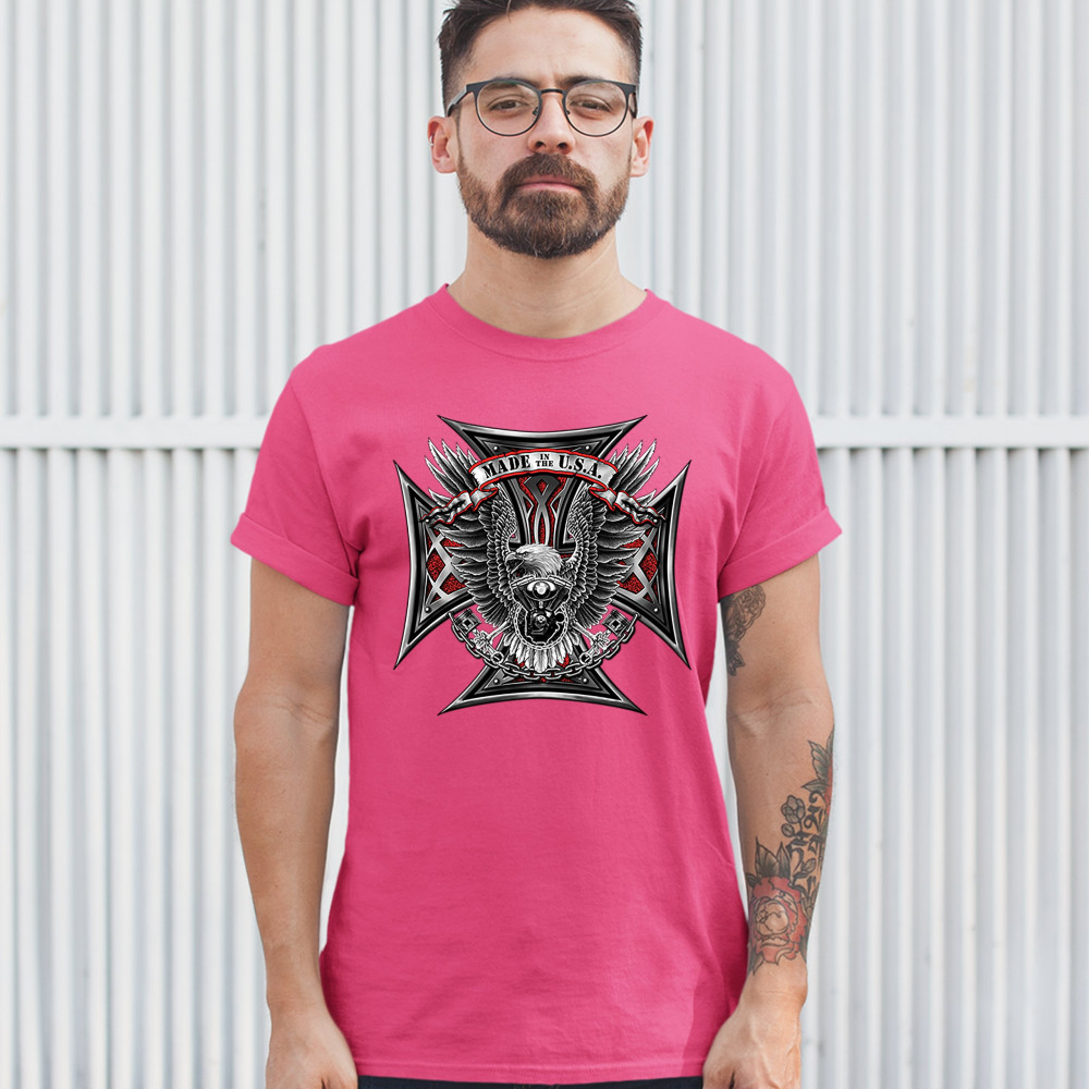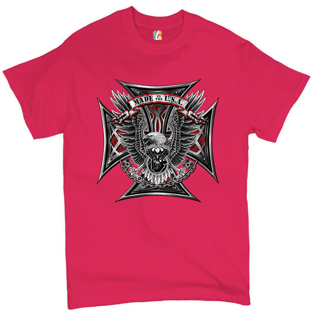 A print featuring a huge cross. In the front there is a bald eagle spreading it's wings and holding pistons in it's talons. In front of it's chest there is a V engine. At the top there is a stripe with "Made in the USA" written on it. A great choice for a