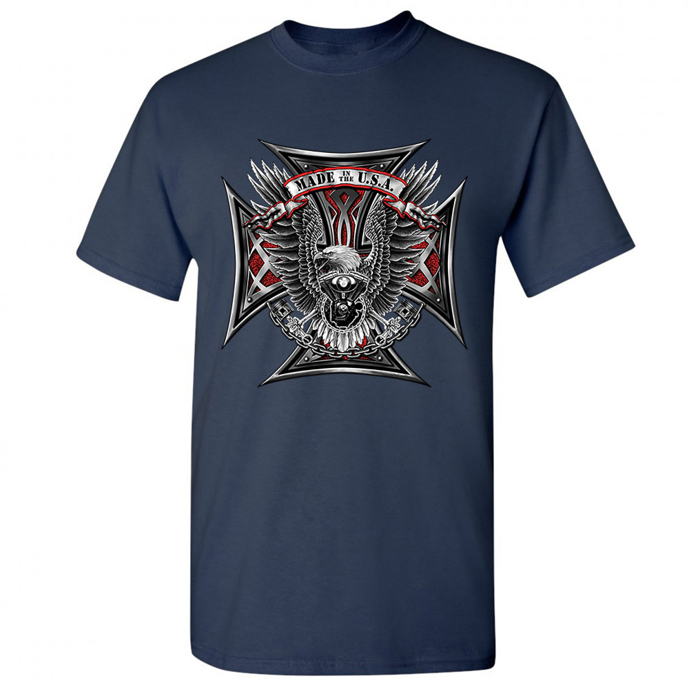 A print featuring a huge cross. In the front there is a bald eagle spreading it's wings and holding pistons in it's talons. In front of it's chest there is a V engine. At the top there is a stripe with "Made in the USA" written on it. A great choice for a