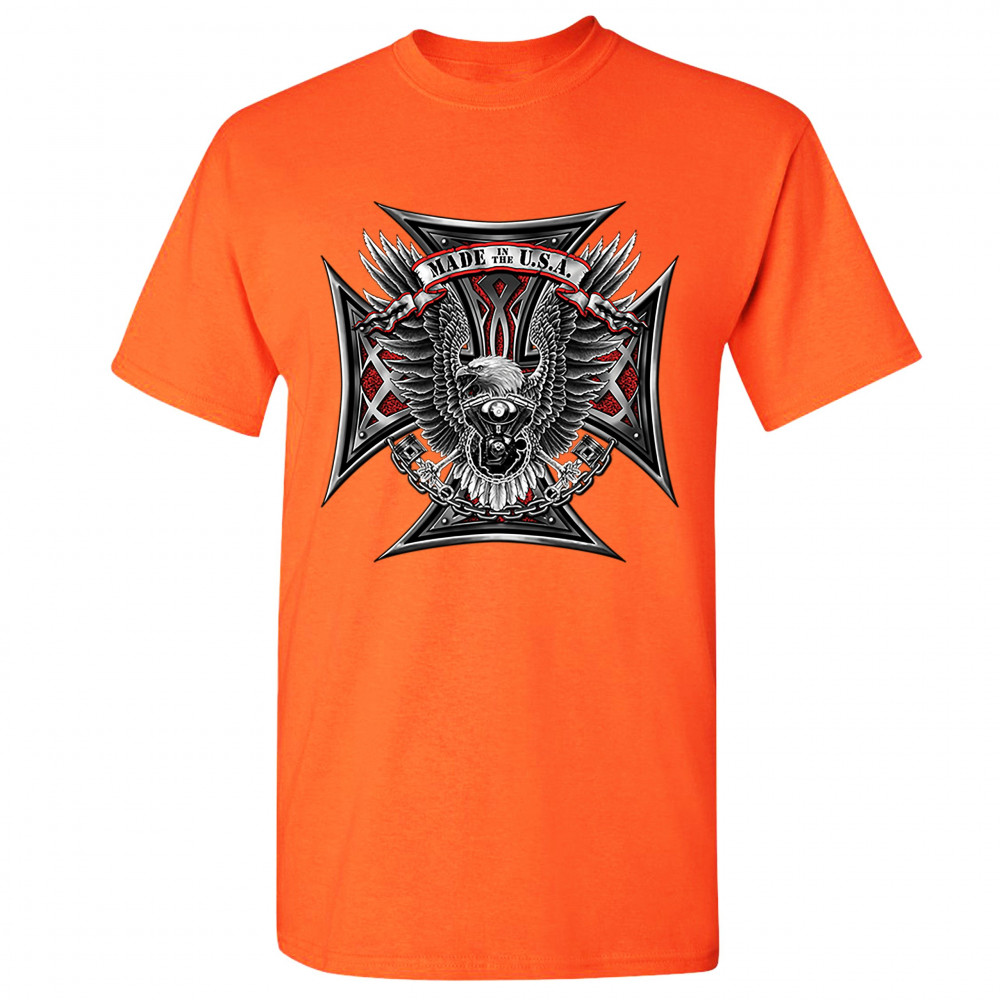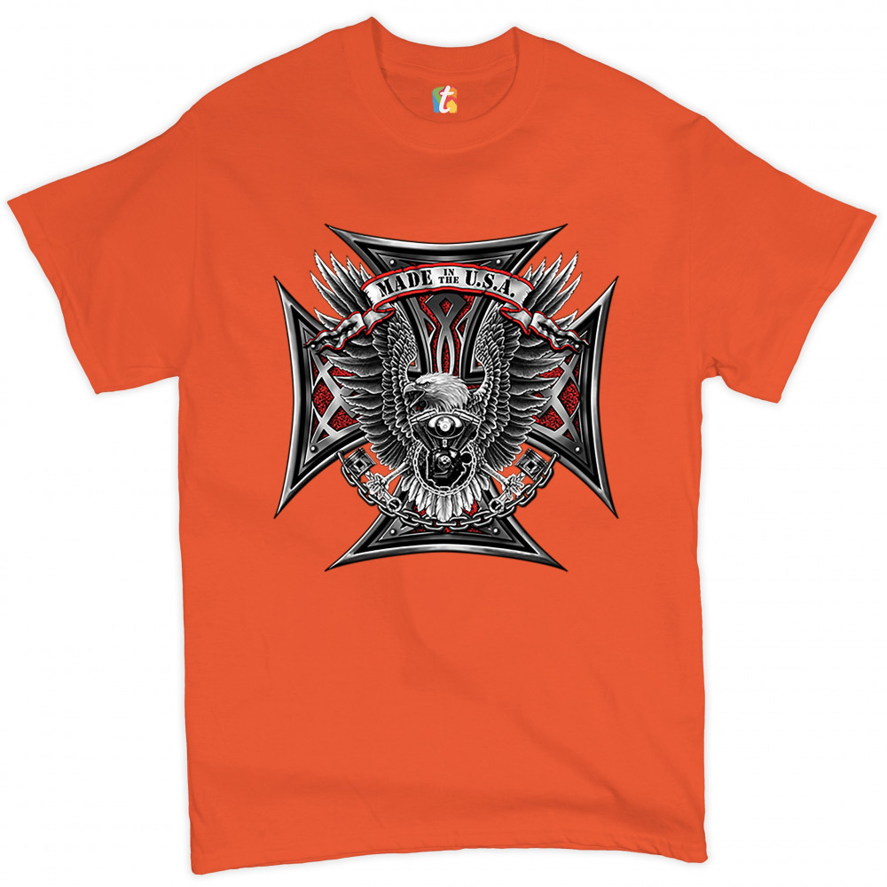A print featuring a huge cross. In the front there is a bald eagle spreading it's wings and holding pistons in it's talons. In front of it's chest there is a V engine. At the top there is a stripe with "Made in the USA" written on it. A great choice for a