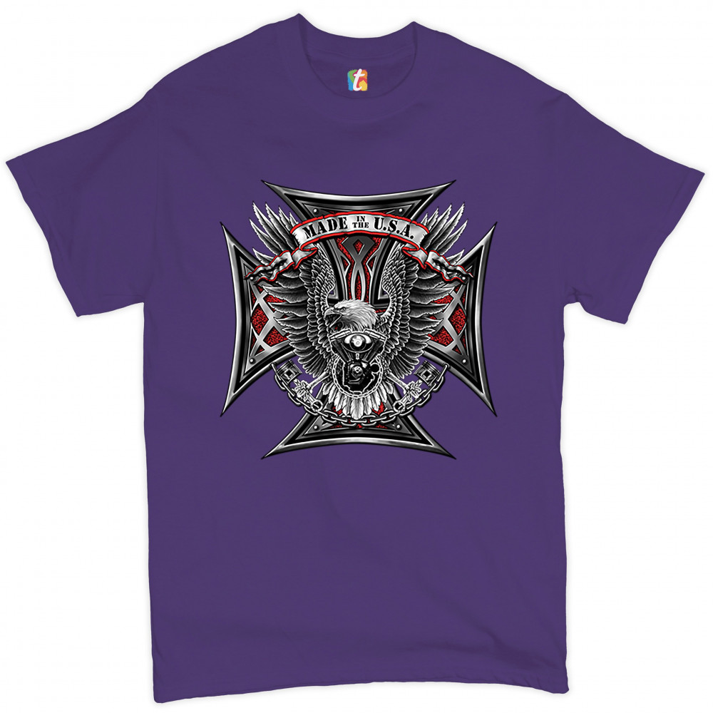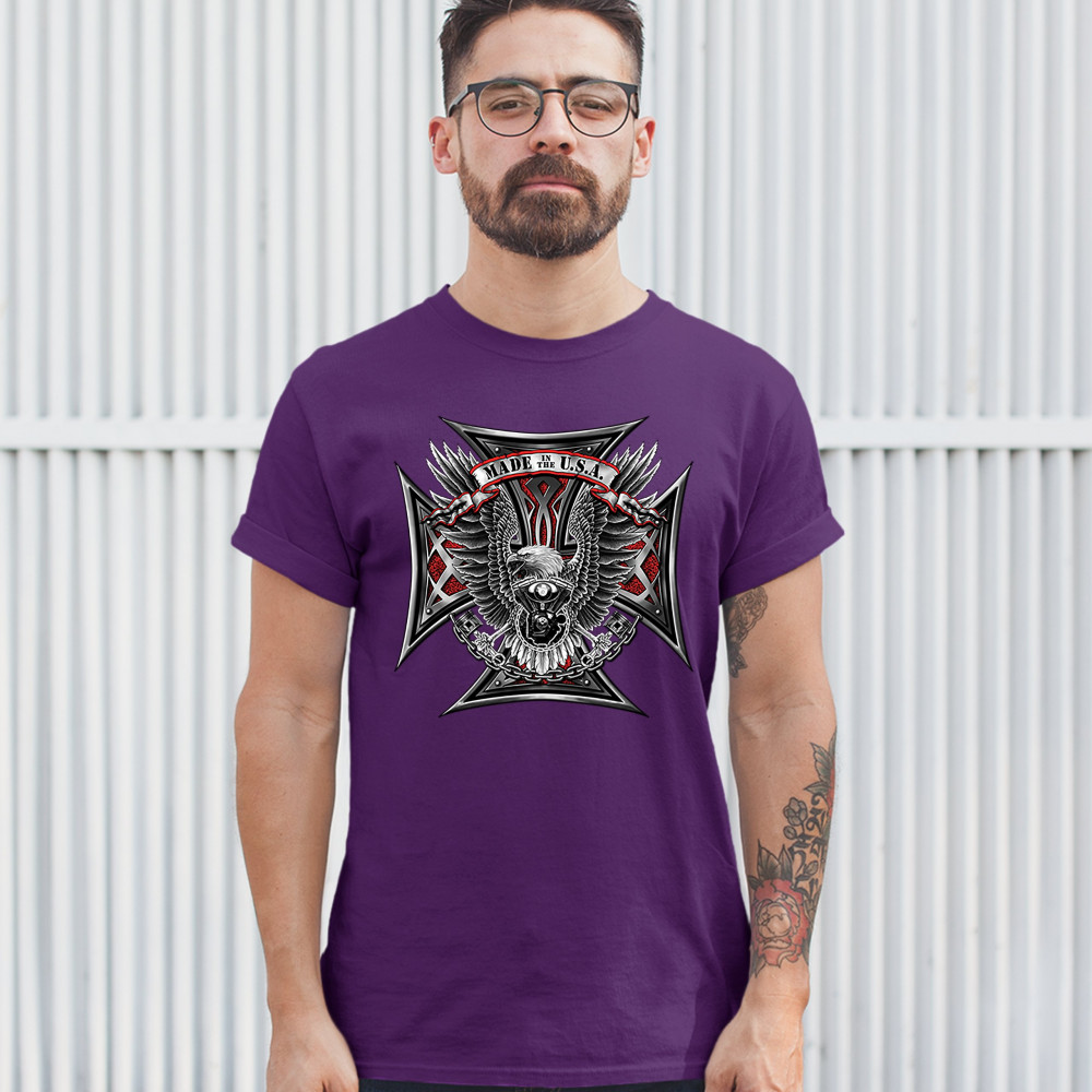 A print featuring a huge cross. In the front there is a bald eagle spreading it's wings and holding pistons in it's talons. In front of it's chest there is a V engine. At the top there is a stripe with "Made in the USA" written on it. A great choice for a