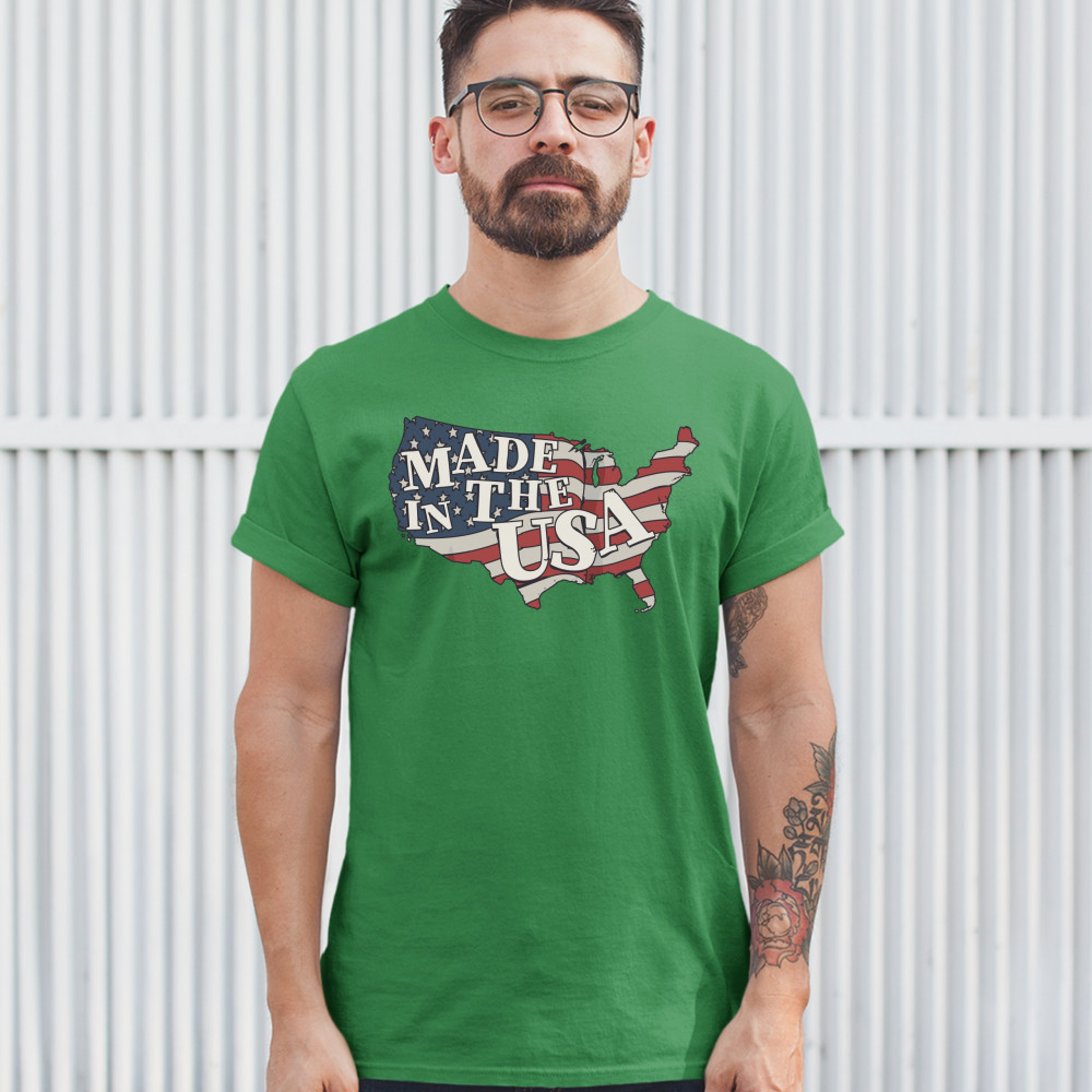 A patriotic print featuring a silhouette of the USA with the American Flag and the phrase "Made in the USA" inside of it. Great choice to wear on Independence Day or any other patriotic holiday.