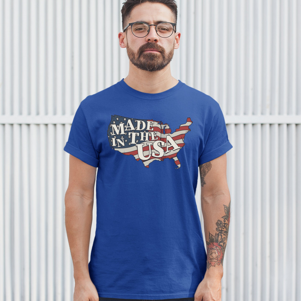 A patriotic print featuring a silhouette of the USA with the American Flag and the phrase "Made in the USA" inside of it. Great choice to wear on Independence Day or any other patriotic holiday.