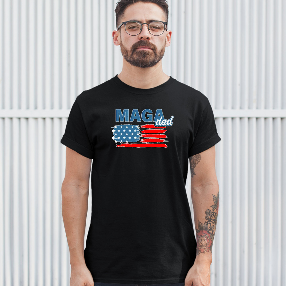 A political print saying "MAGA dad" and featuring the American flag. A great choice to wear for a Trump rally or give as a gift to a Donald Trump and Mike Pence supporter before 2020 presidential elections.