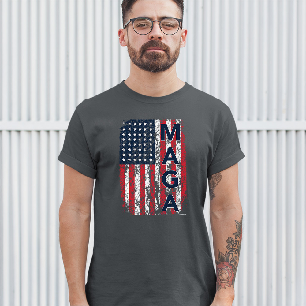 A political print featuring the American flag with the acronym MAGA written over it. A great choice to wear for a Trump rally or give as a gift to a Donald Trump and Mike Pence supporter before 2020 presidential elections.