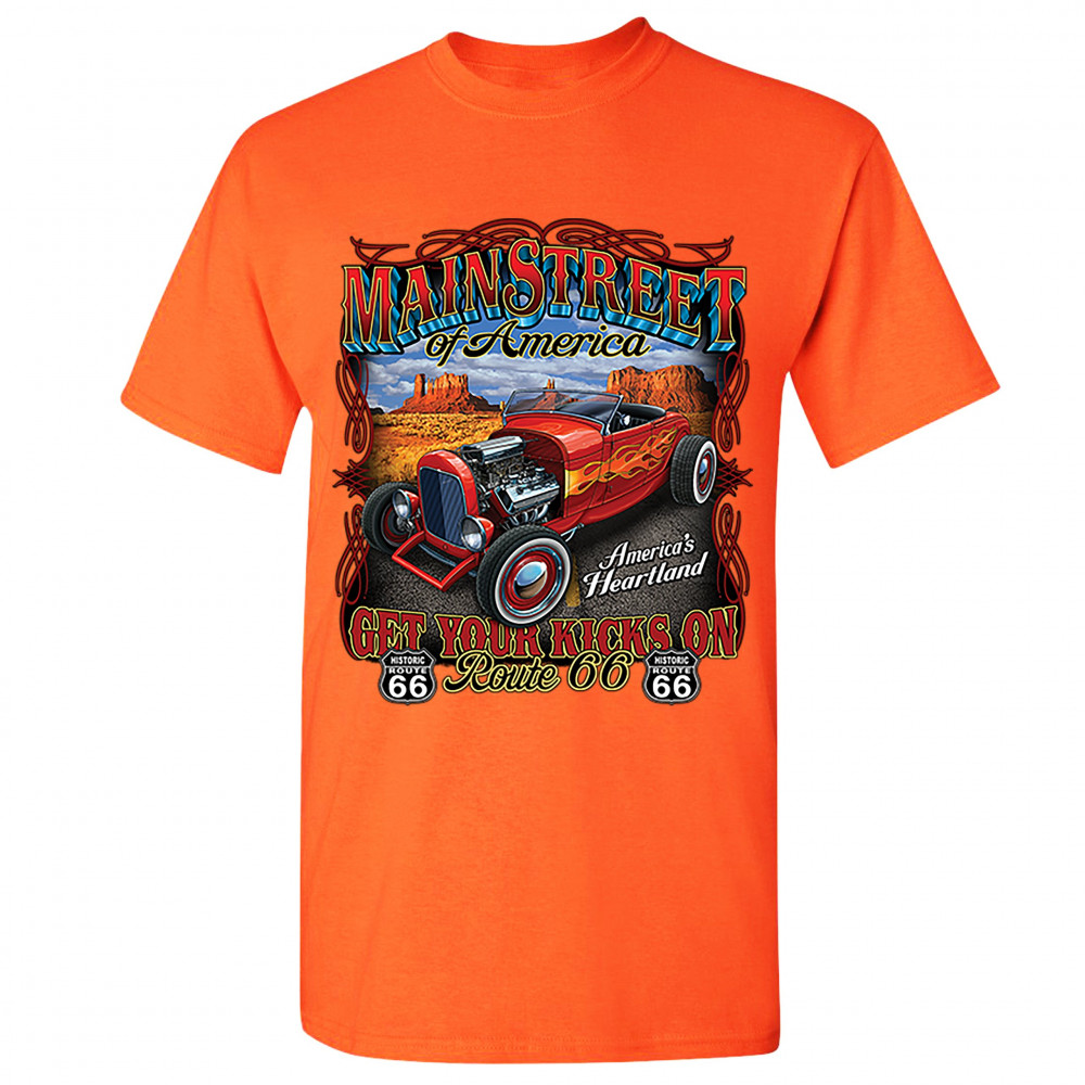 A print featuring a vintage hot rod with an exposed engine and flame paint job parked on a highway. The print says: "Main Street of America", "America's Heartland" and "Get Your Kicks on Route 66". The print also features two Route 66 signs. A great choic