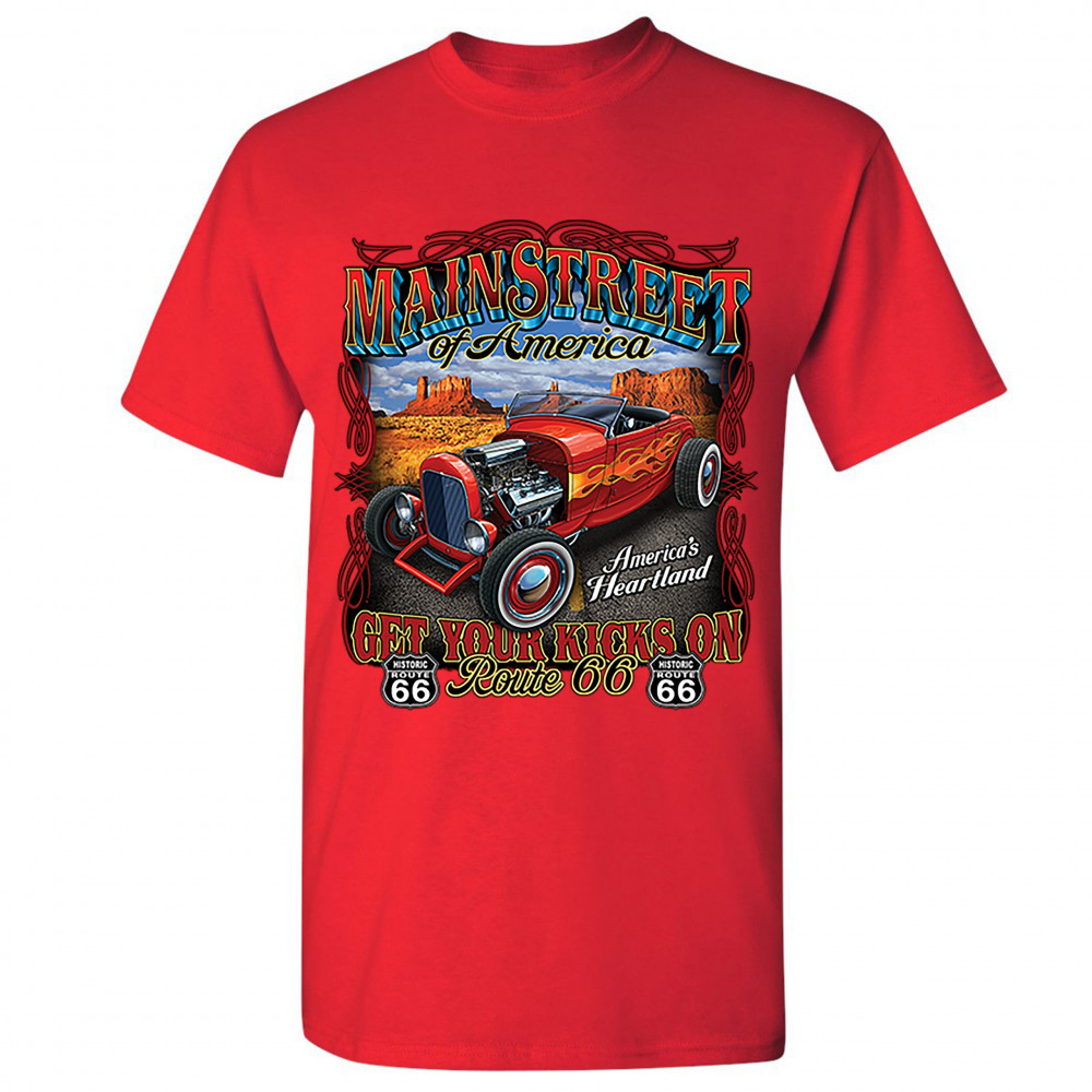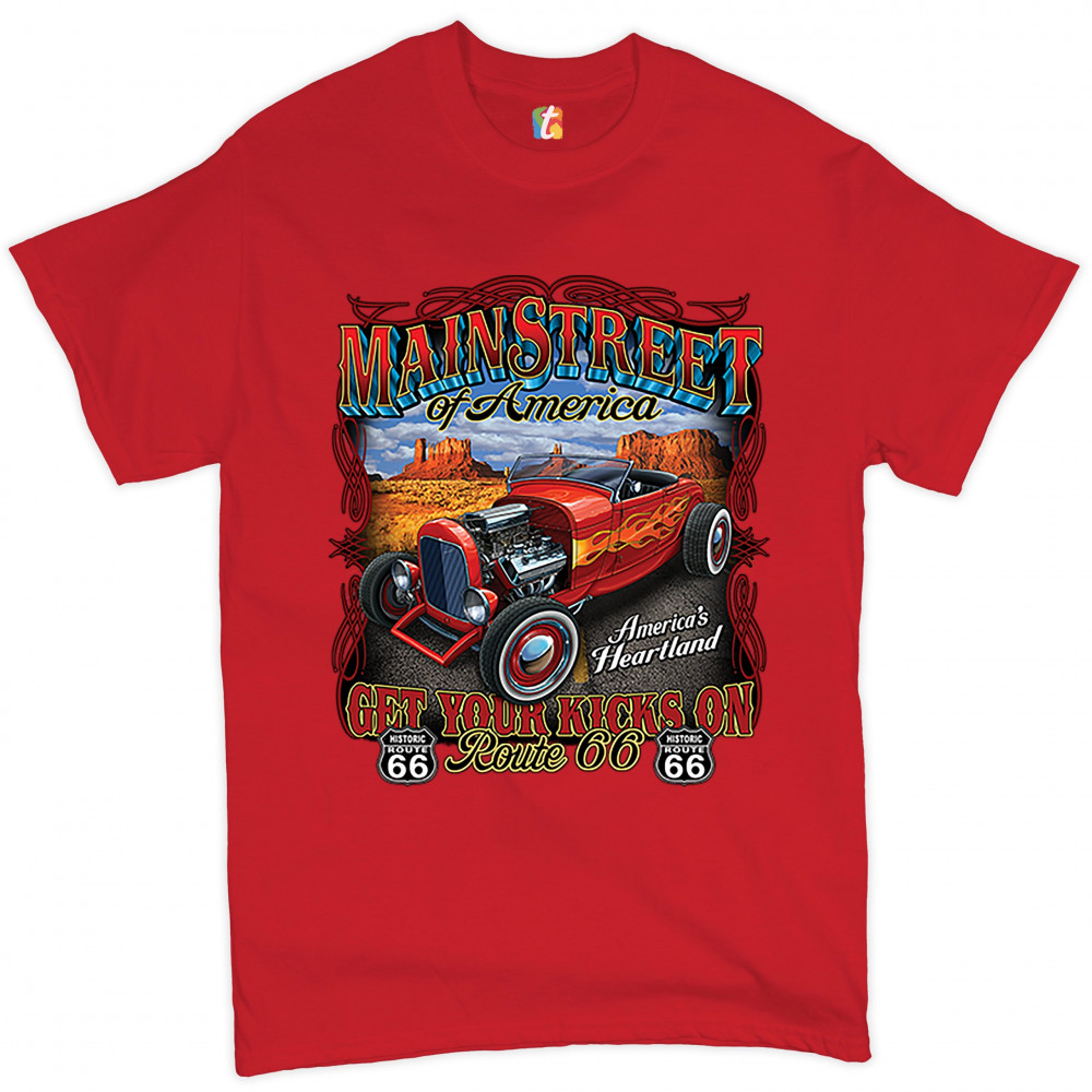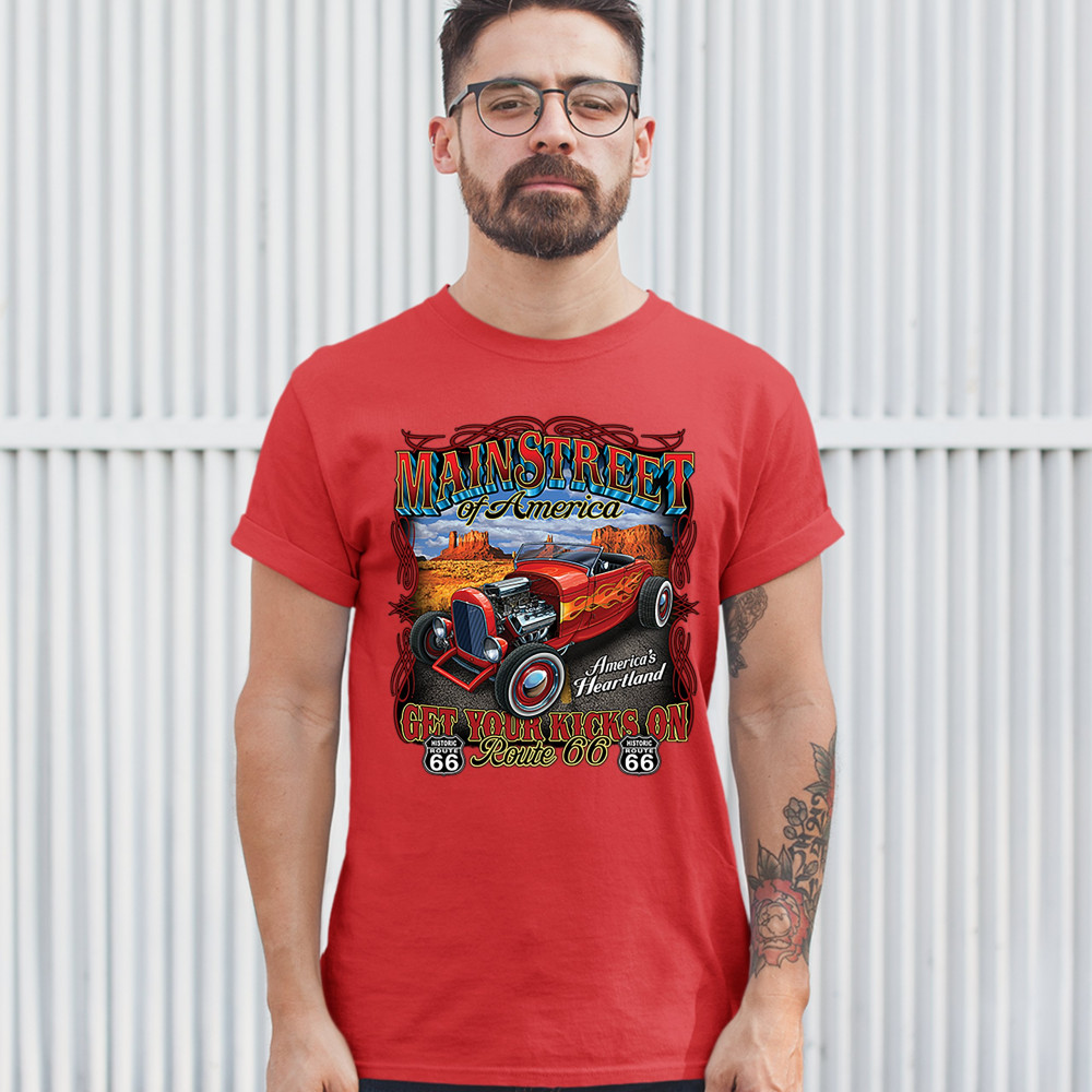 A print featuring a vintage hot rod with an exposed engine and flame paint job parked on a highway. The print says: "Main Street of America", "America's Heartland" and "Get Your Kicks on Route 66". The print also features two Route 66 signs. A great choic