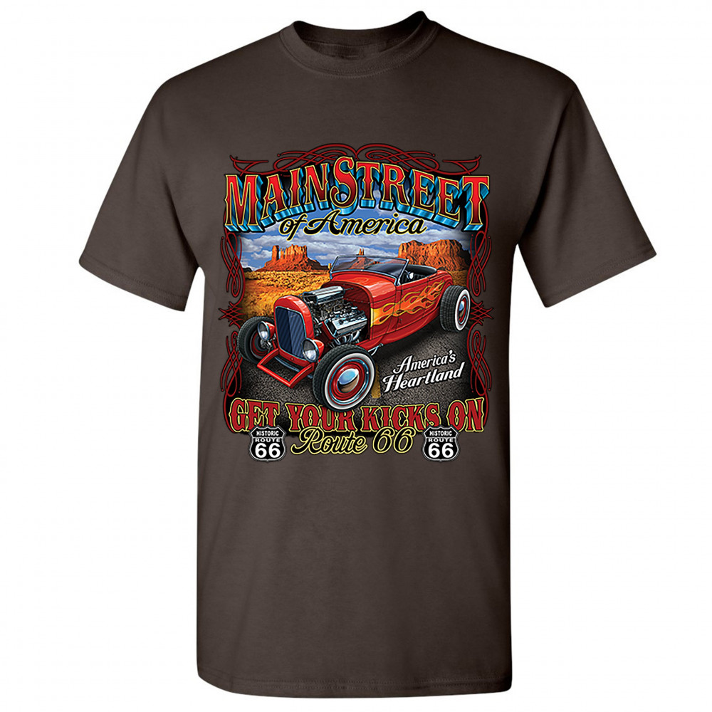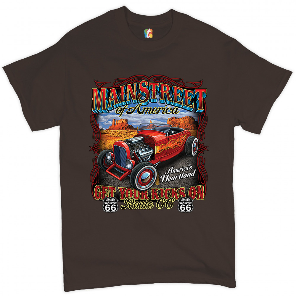A print featuring a vintage hot rod with an exposed engine and flame paint job parked on a highway. The print says: "Main Street of America", "America's Heartland" and "Get Your Kicks on Route 66". The print also features two Route 66 signs. A great choic