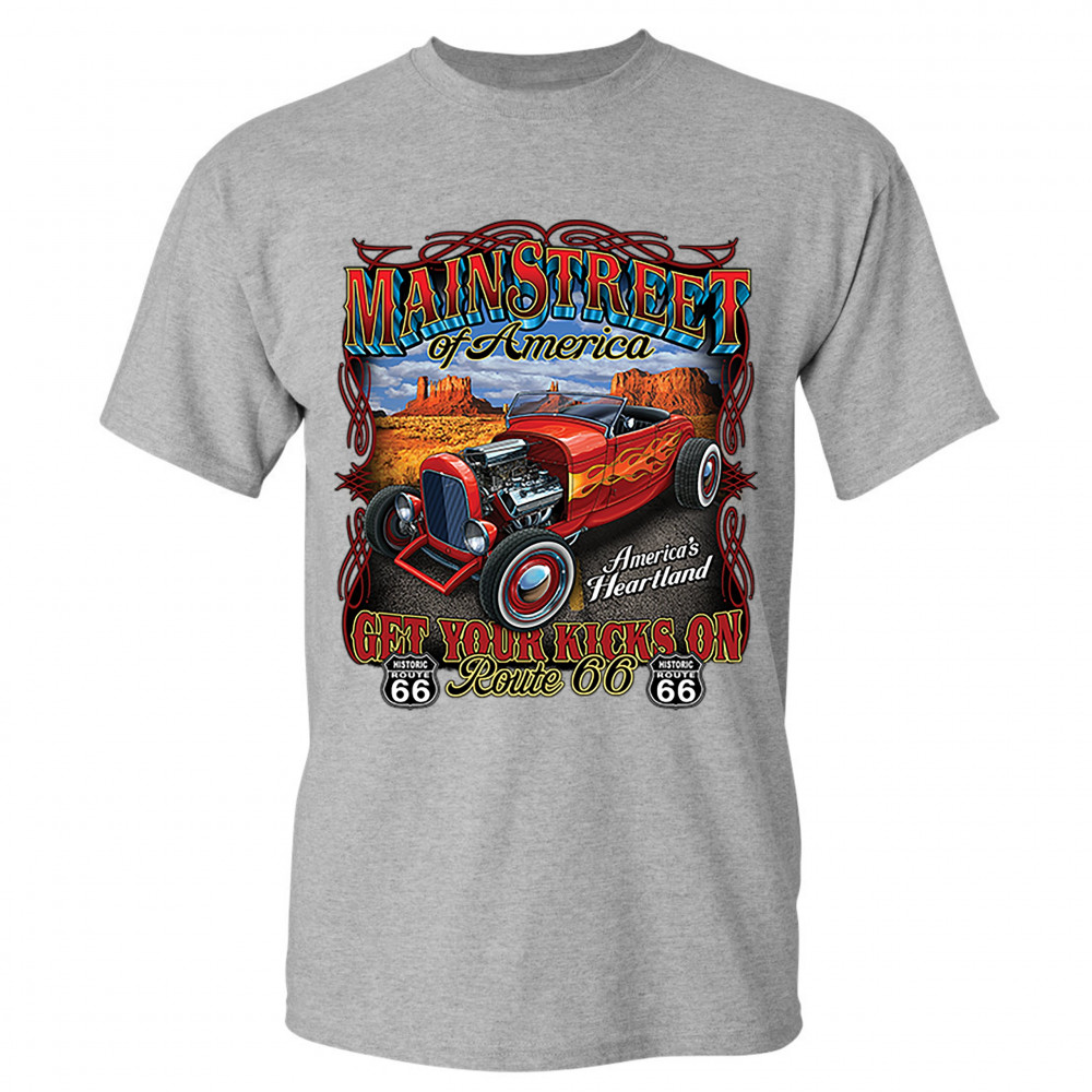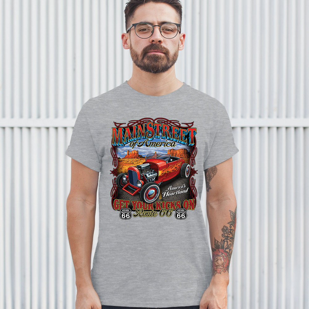 A print featuring a vintage hot rod with an exposed engine and flame paint job parked on a highway. The print says: "Main Street of America", "America's Heartland" and "Get Your Kicks on Route 66". The print also features two Route 66 signs. A great choic