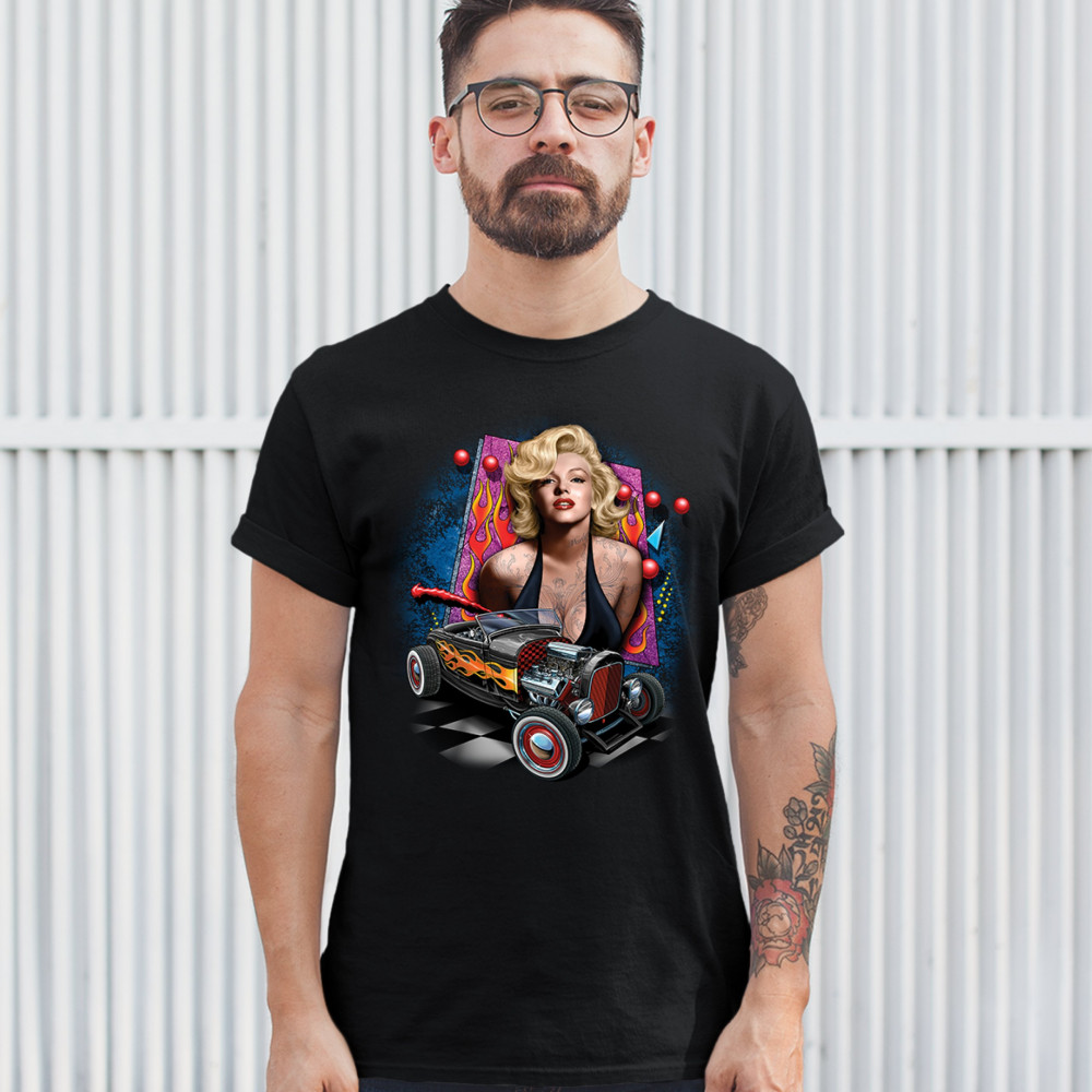 MARILYN MONROE HOT ROD t-shirt vintage route 66 drag racing men's tee black