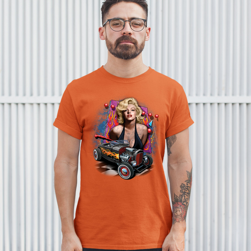 MARILYN MONROE HOT ROD t-shirt vintage route 66 drag racing men's tee orange