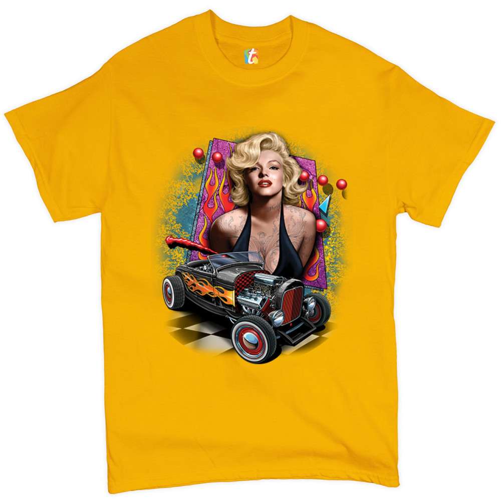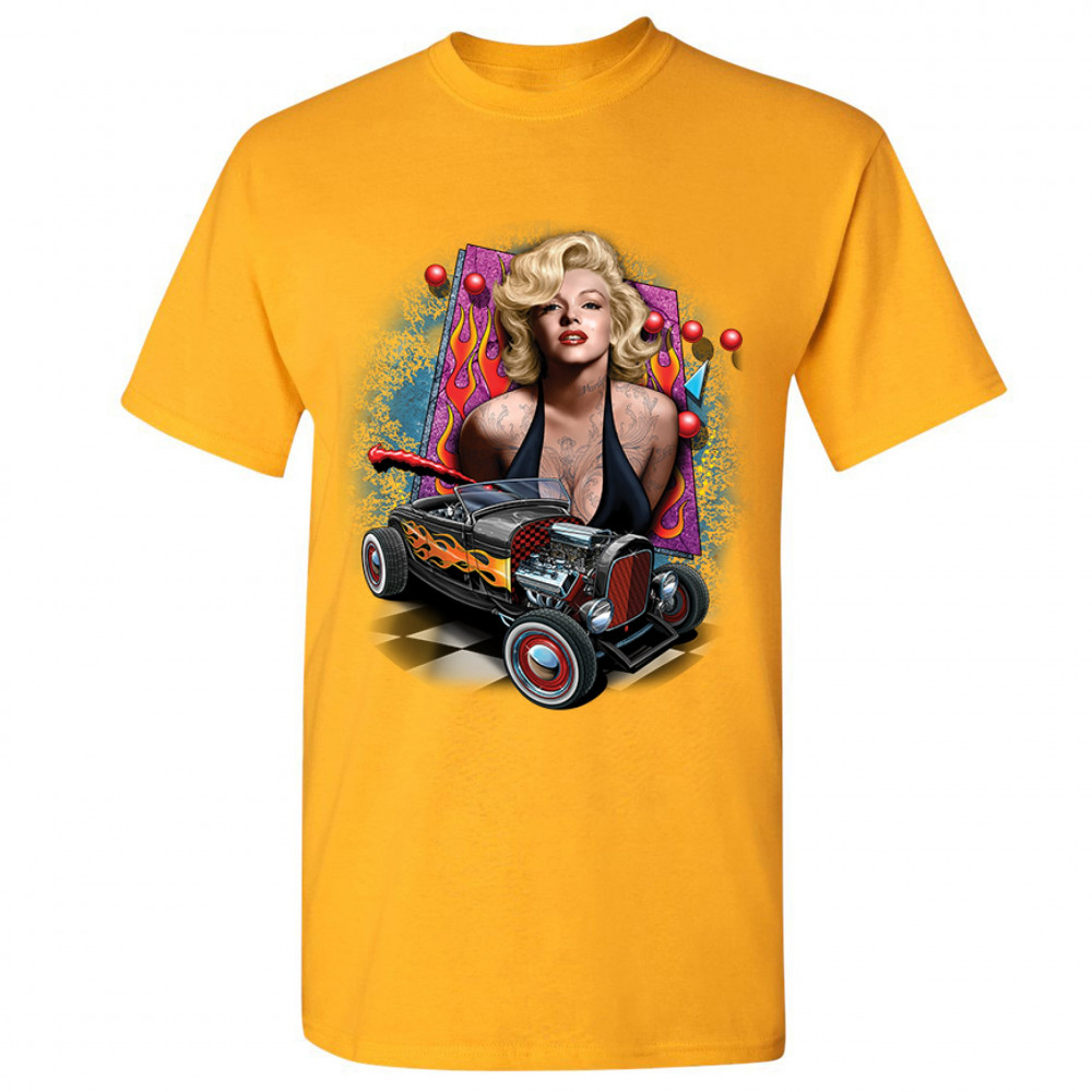 MARILYN MONROE HOT ROD t-shirt vintage route 66 drag racing men's tee yellow