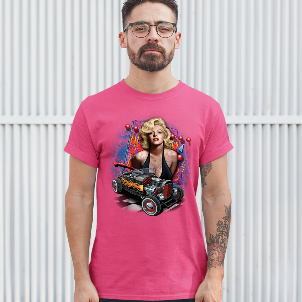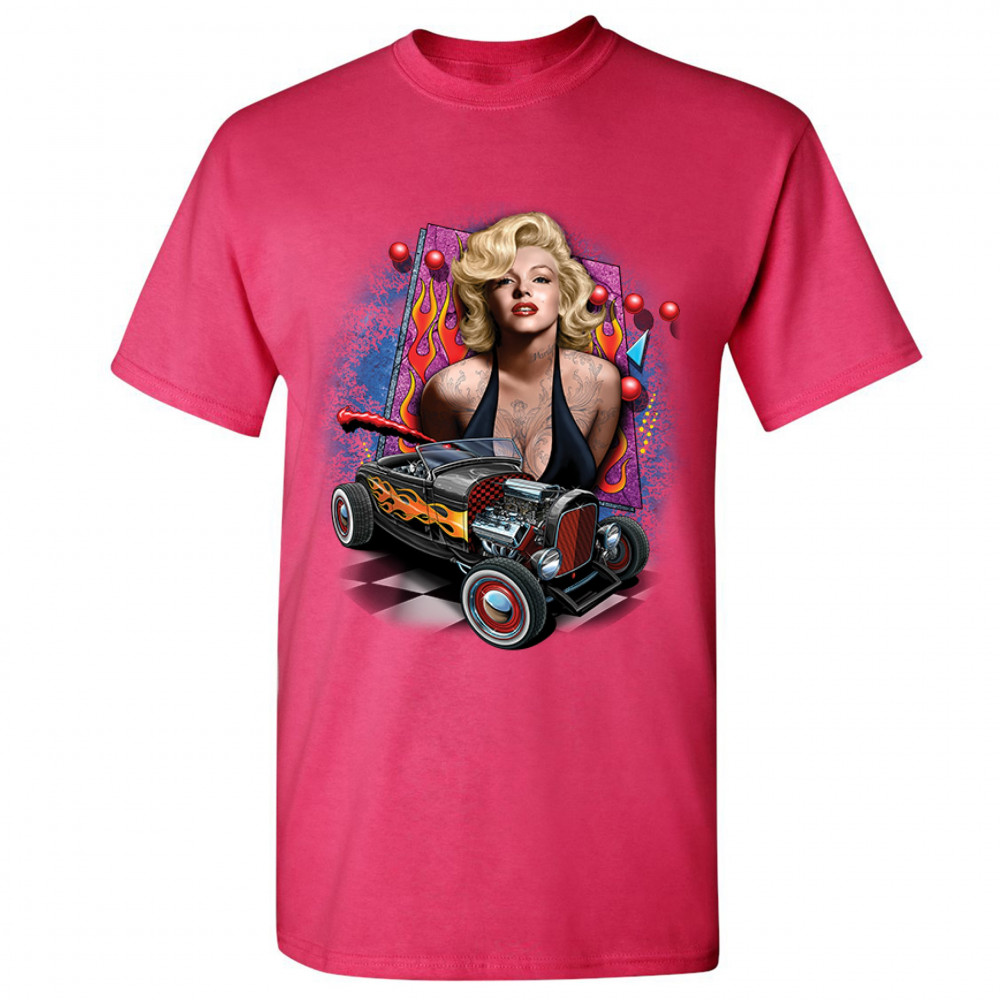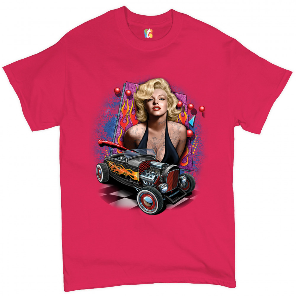 MARILYN MONROE HOT ROD t-shirt vintage route 66 drag racing men's tee hot pink