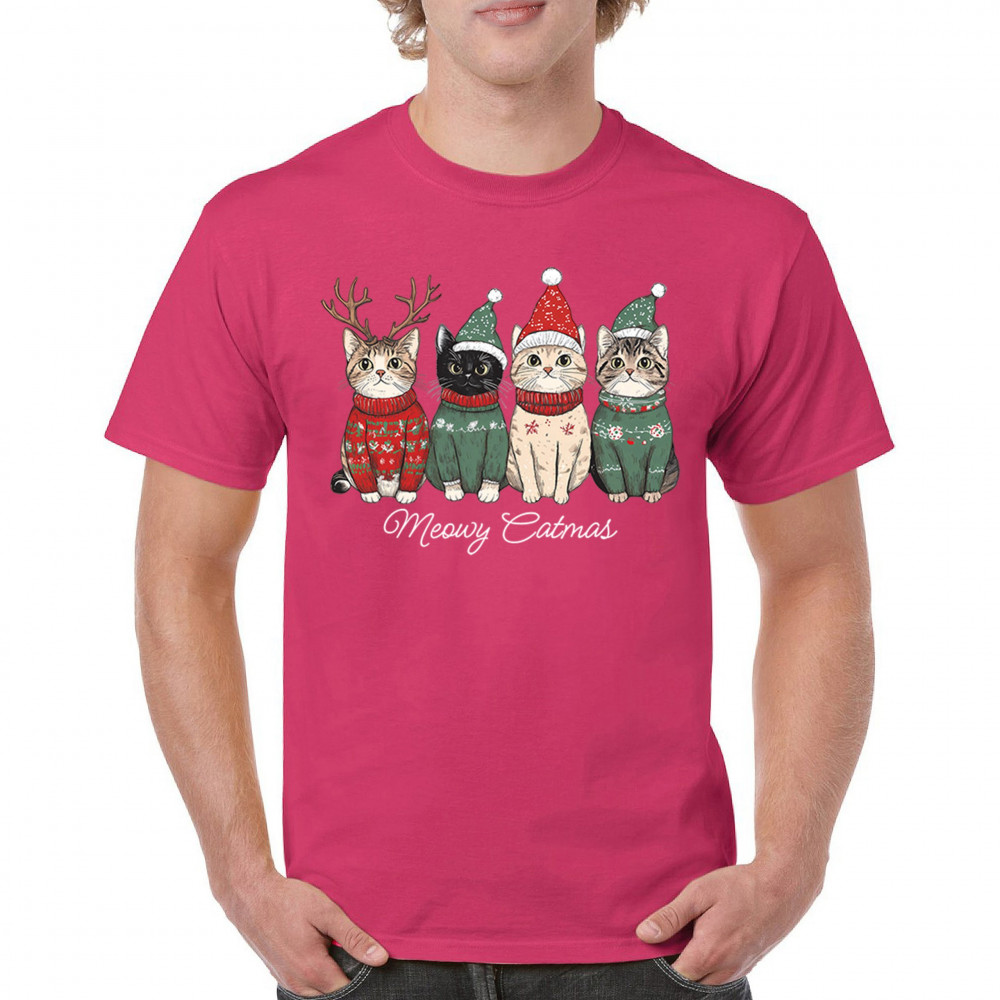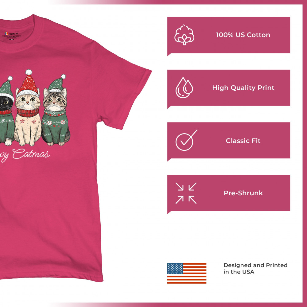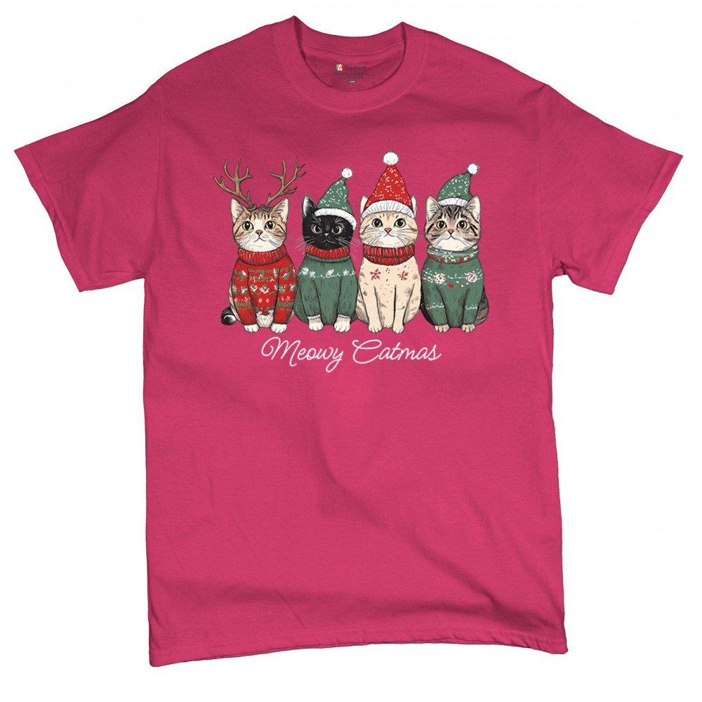 Cute Meowy Catmas design with festive kittens, perfect for cat lovers wanting a cozy holiday graphic and fun Christmas pet theme.