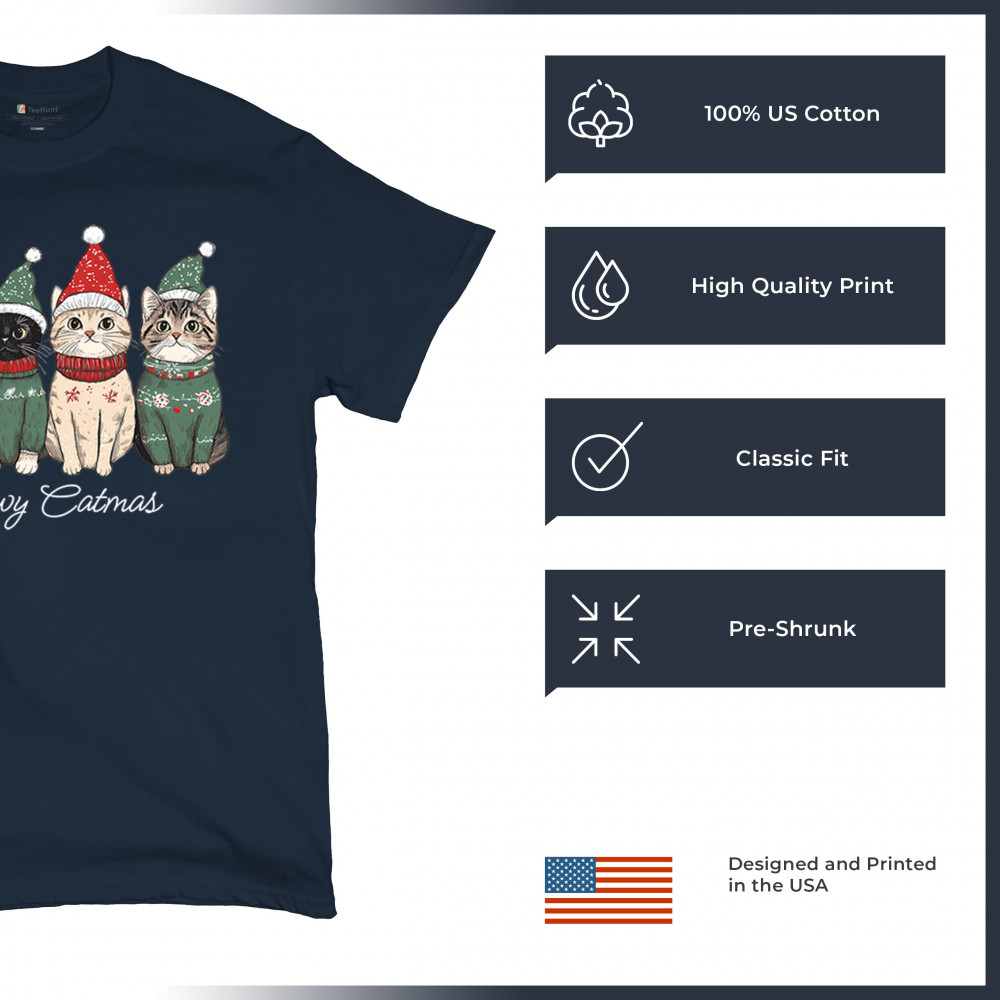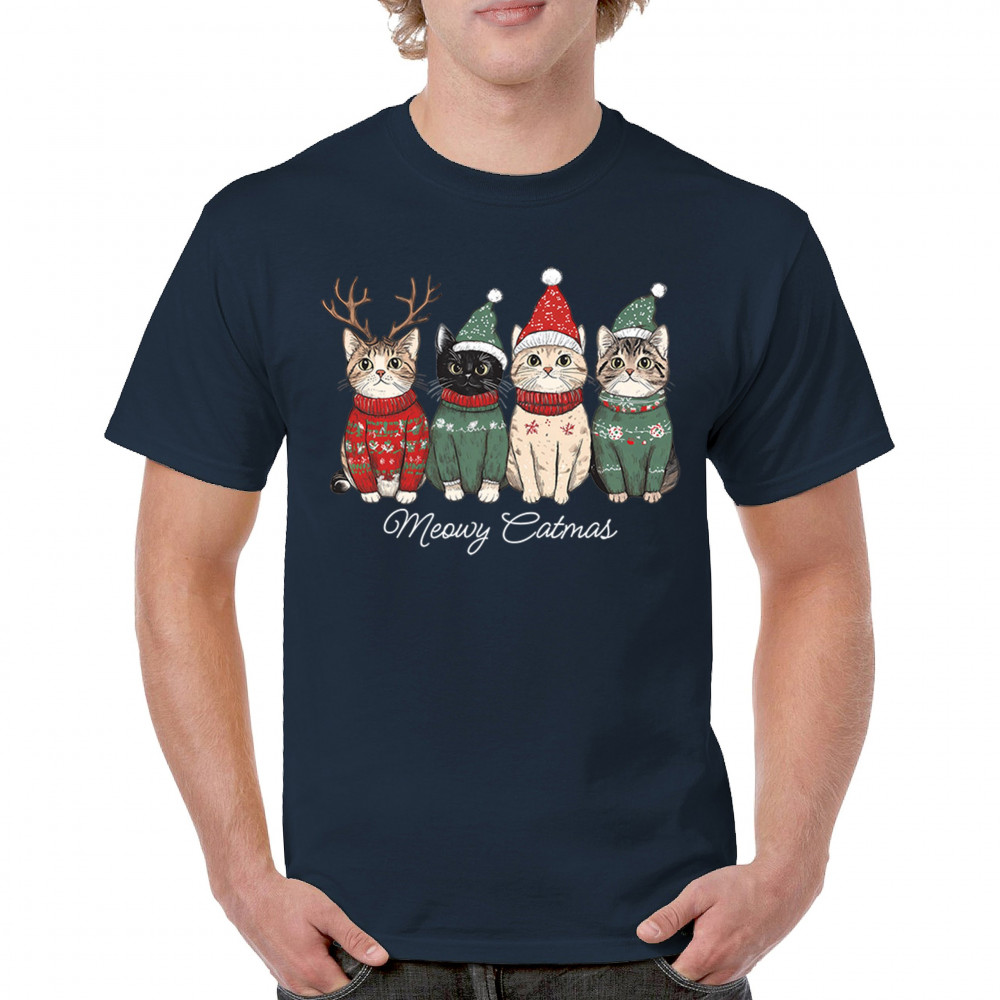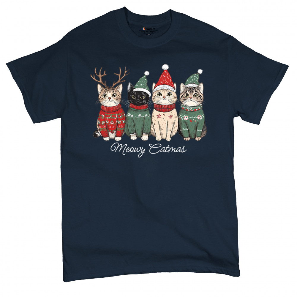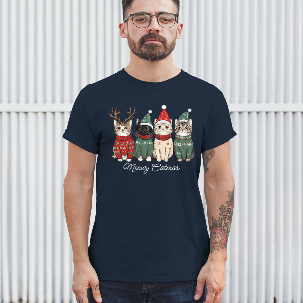 Cute Meowy Catmas design with festive kittens, perfect for cat lovers wanting a cozy holiday graphic and fun Christmas pet theme.