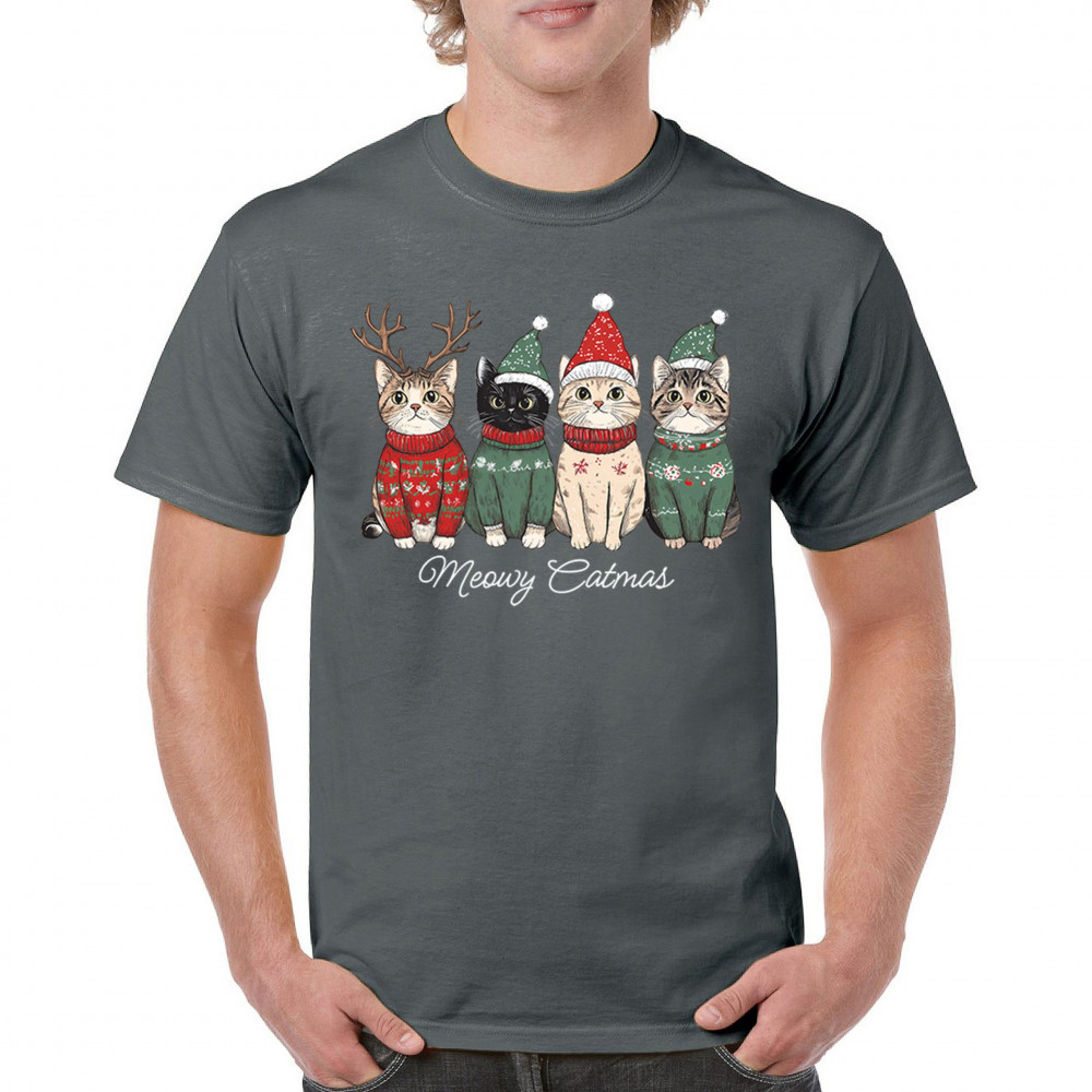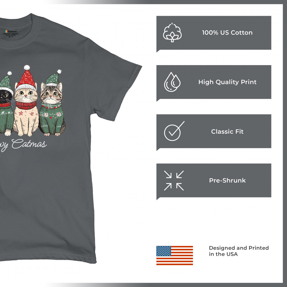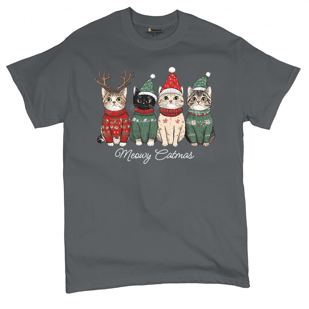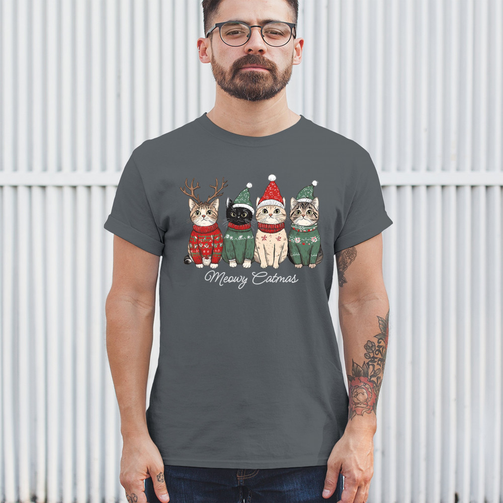 Cute Meowy Catmas design with festive kittens, perfect for cat lovers wanting a cozy holiday graphic and fun Christmas pet theme.