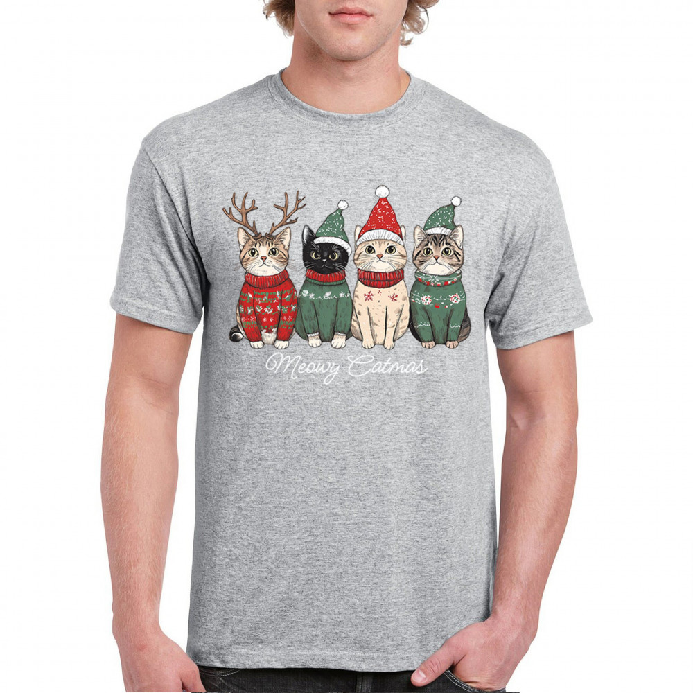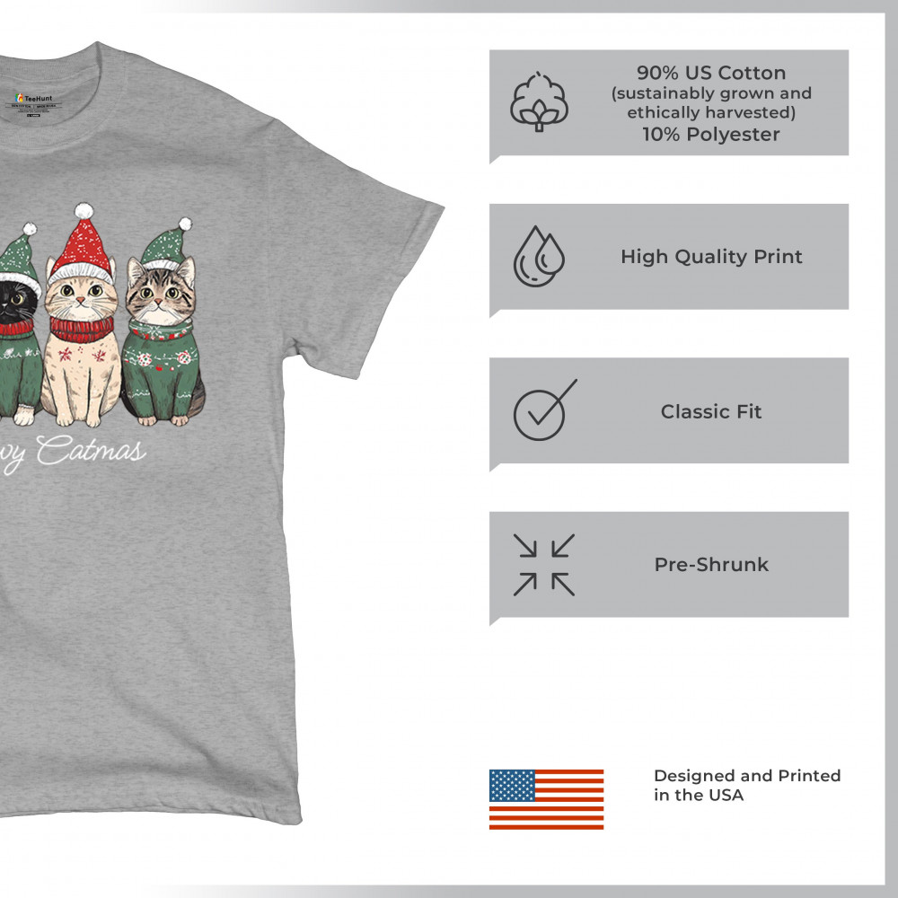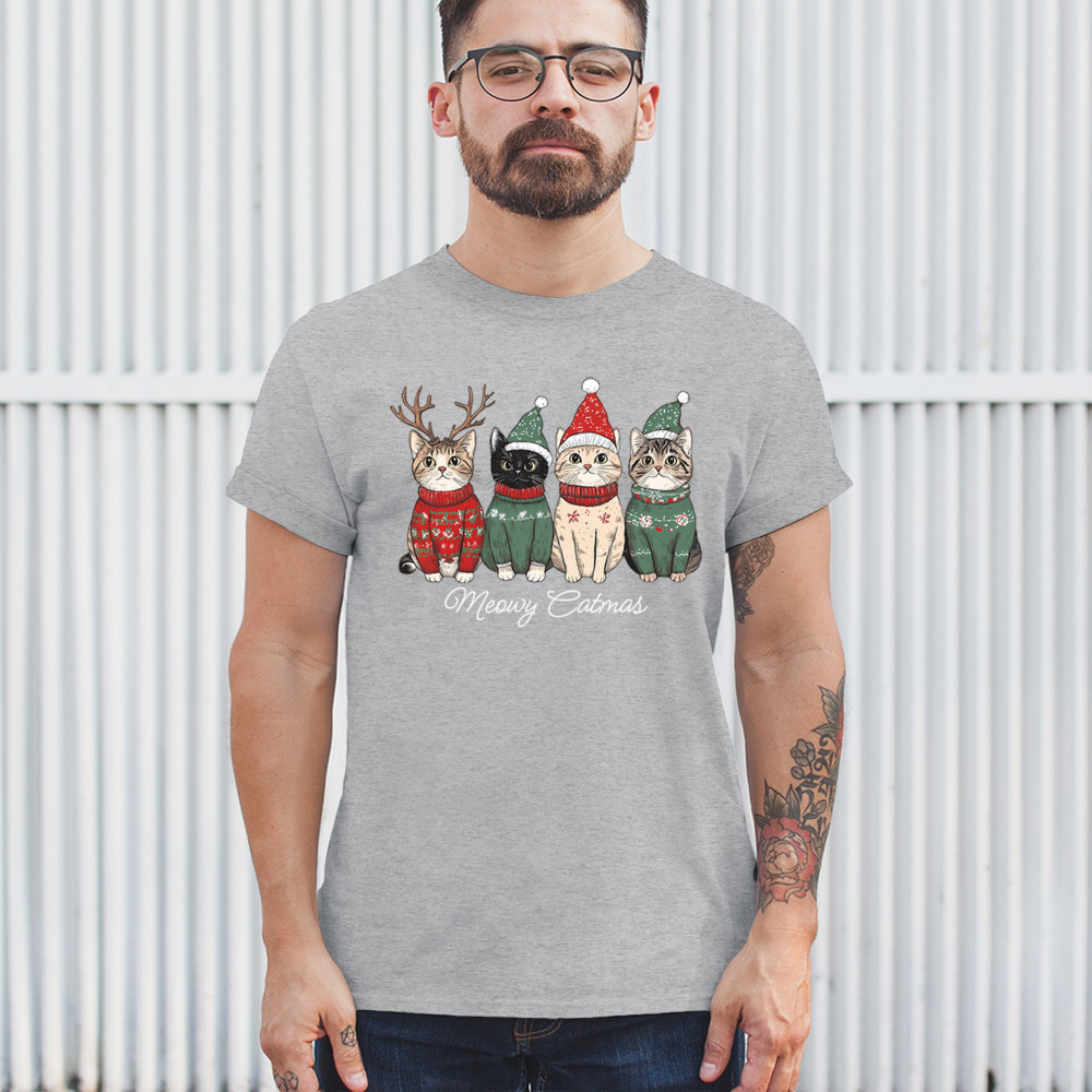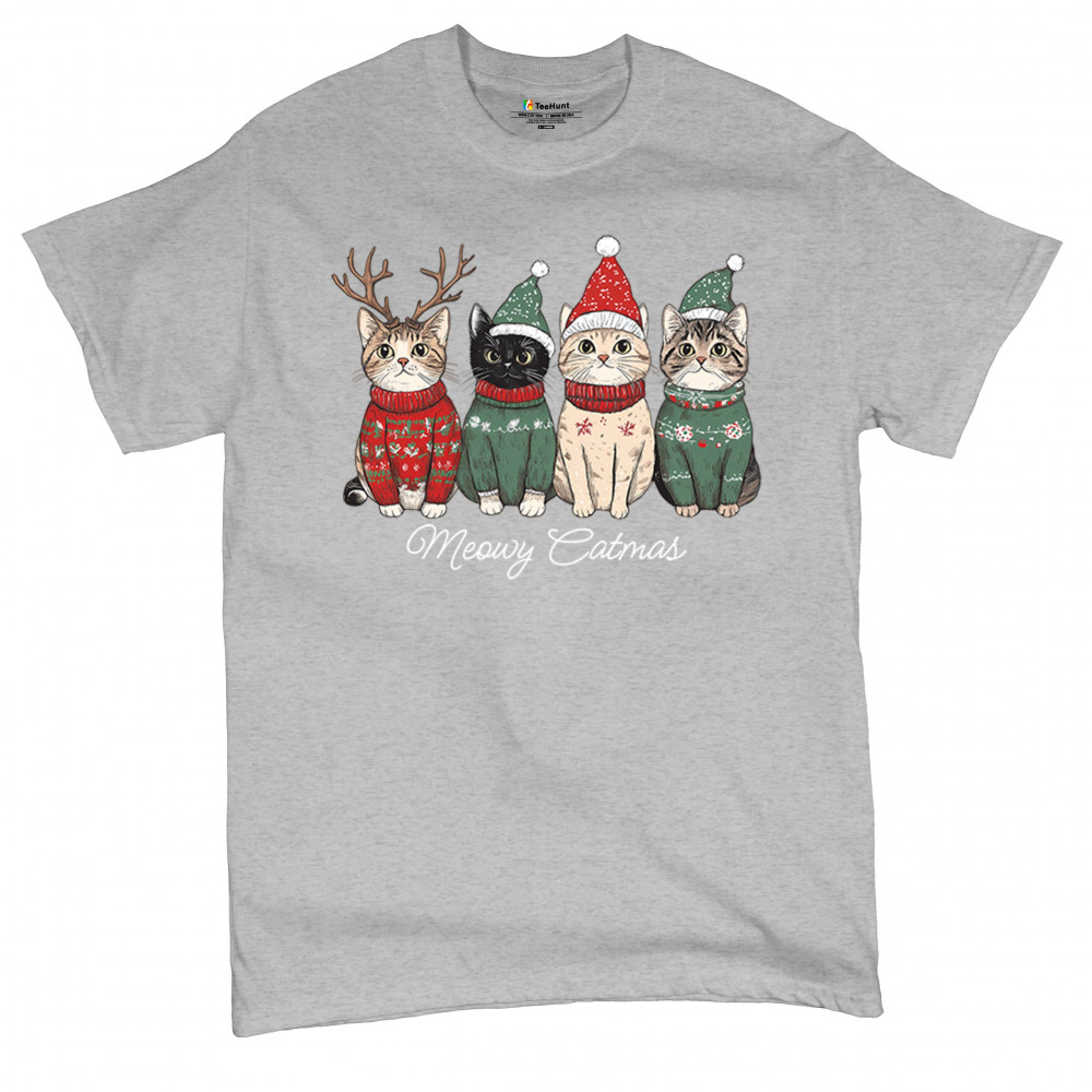 Cute Meowy Catmas design with festive kittens, perfect for cat lovers wanting a cozy holiday graphic and fun Christmas pet theme.