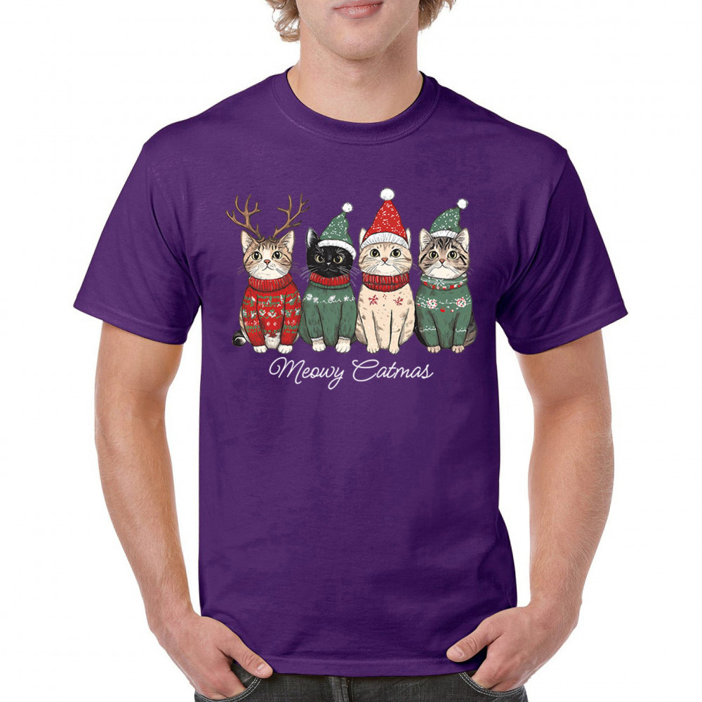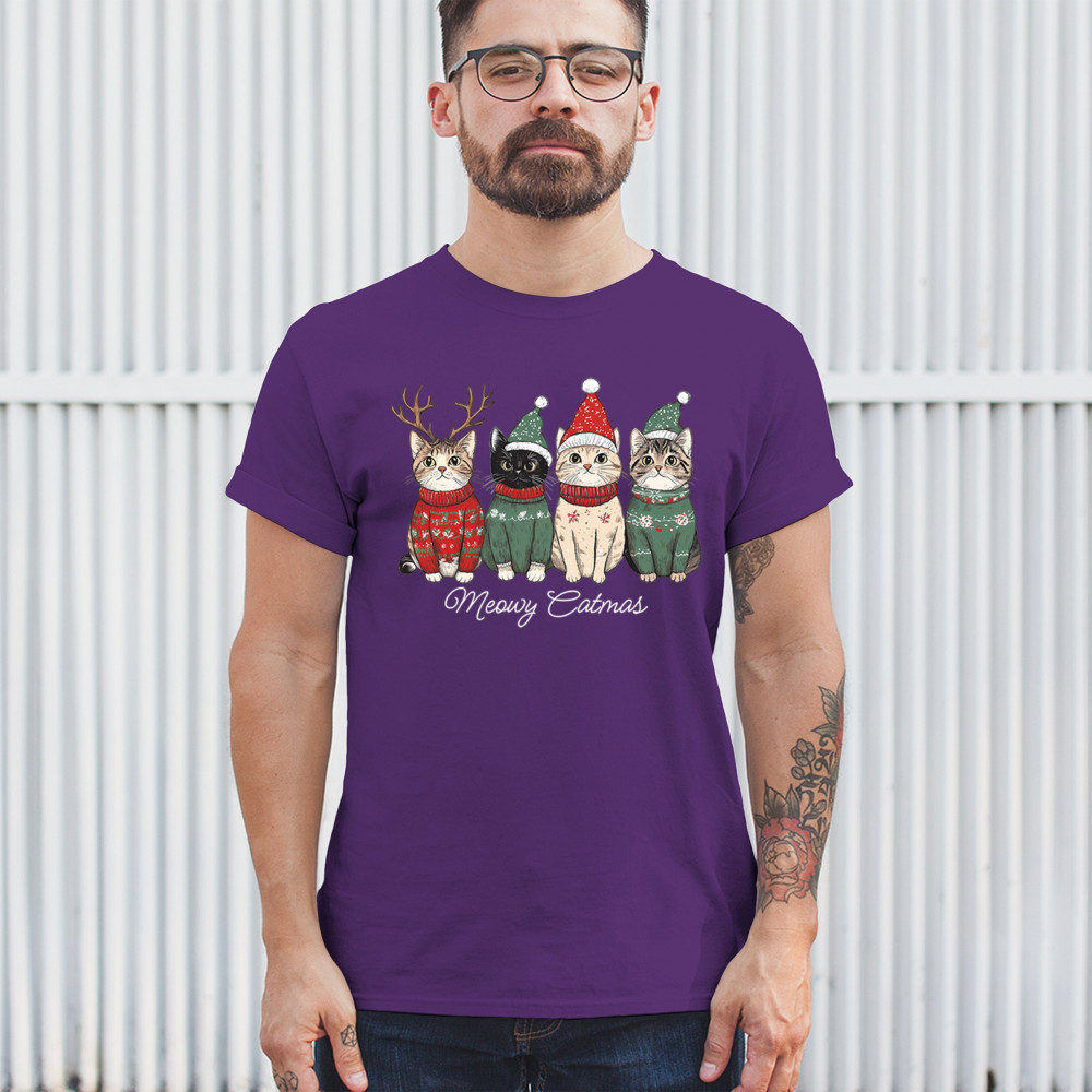 Cute Meowy Catmas design with festive kittens, perfect for cat lovers wanting a cozy holiday graphic and fun Christmas pet theme.