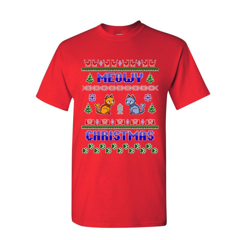 MEOWY CHRISTMAS UGLY SWEATER t-shirt cat kitten purr merry xmas mens tee shirt red