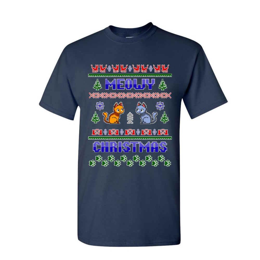 MEOWY CHRISTMAS UGLY SWEATER t-shirt cat kitten purr merry xmas mens tee shirt navy blue