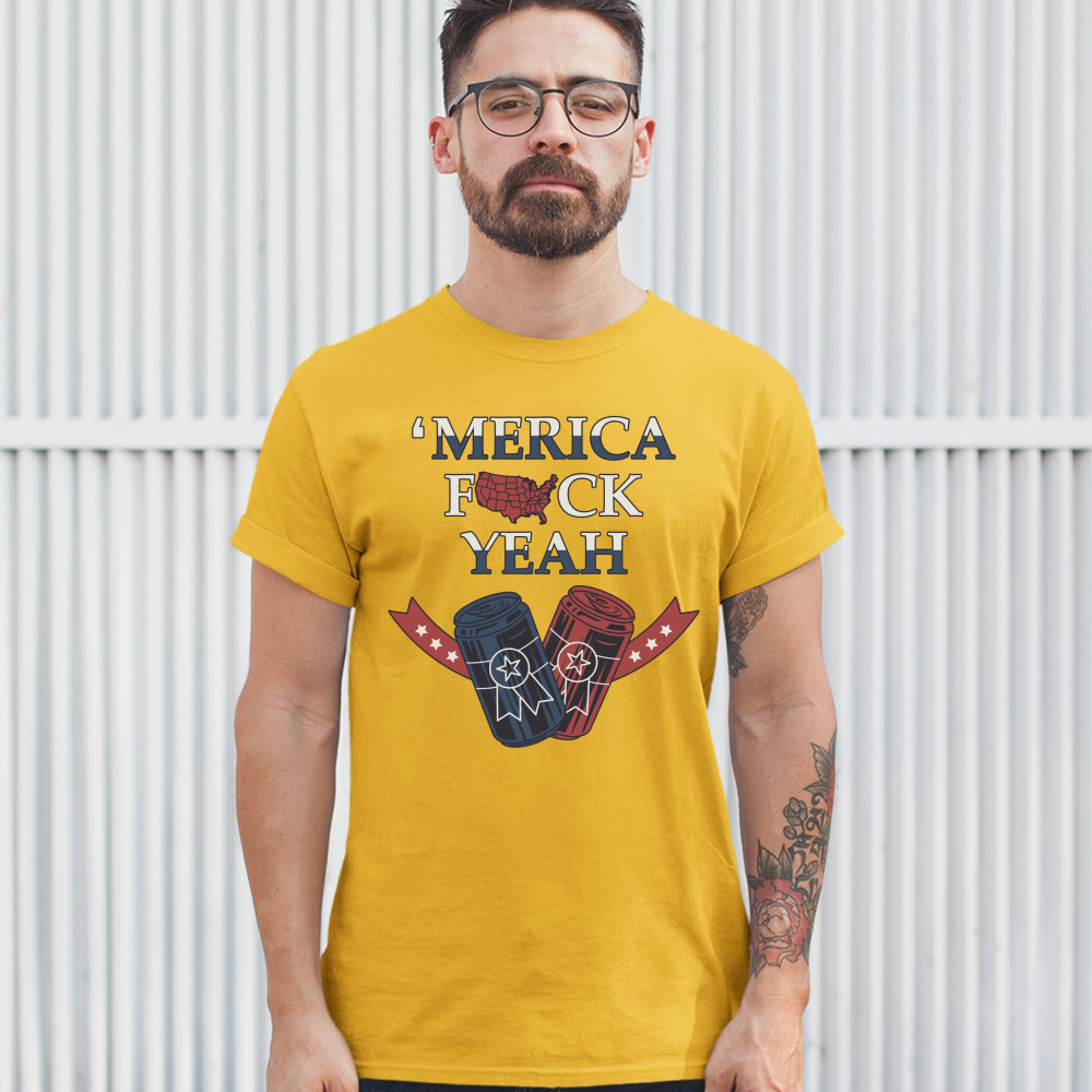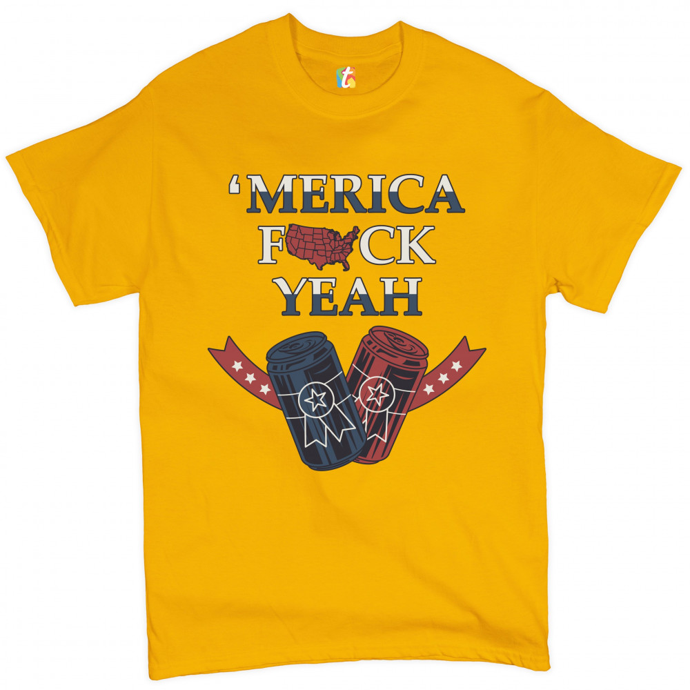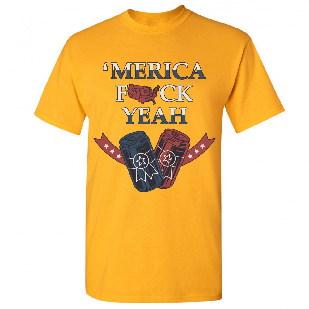 MERICA F*CK YEAH t-shirt patriotic american pride drinking beer men's tee yellow