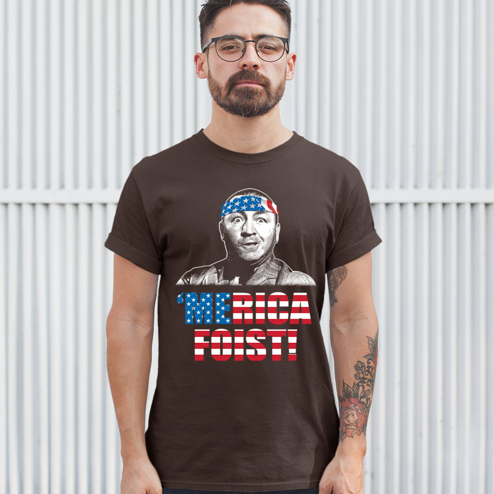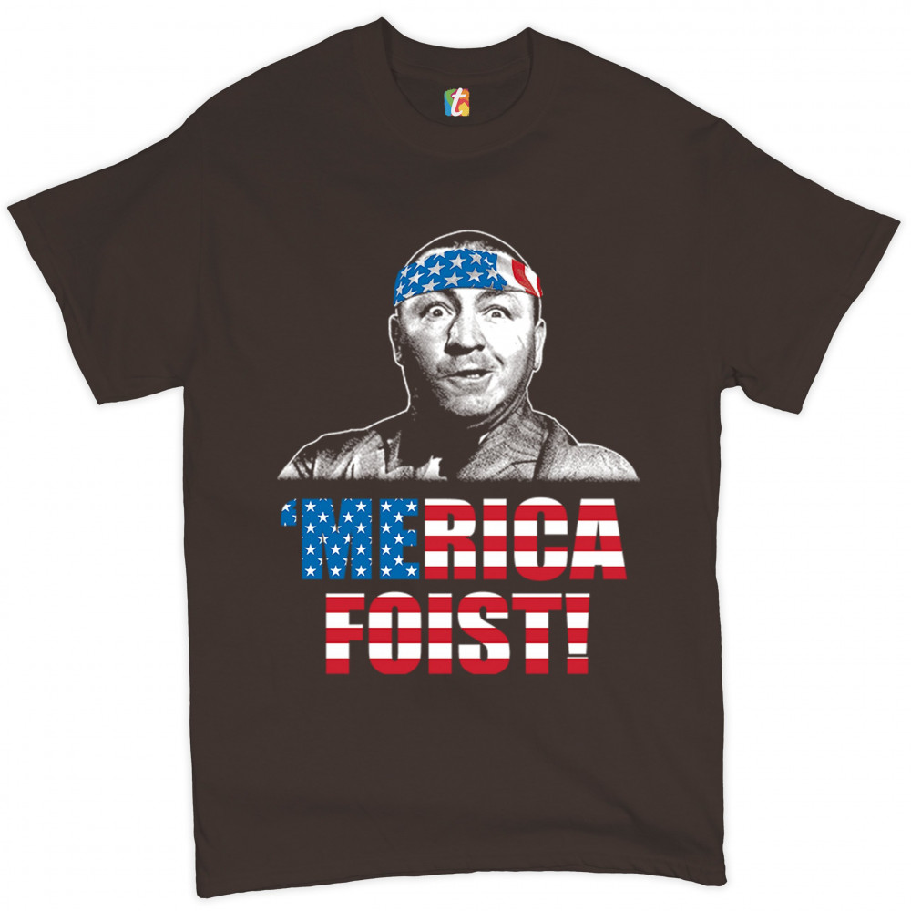 A funny patriotic print saying: "'Merica Foist" and depicting grinning Curly Howard wearing an American flag bandana. The words are decorated with the Stars and Stripes of the American flag. A great gift for anyone who is a fan of the legendary TV show.
