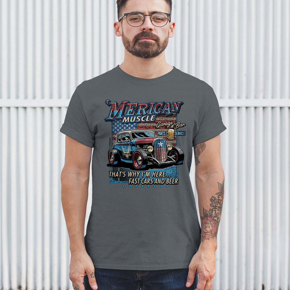 Drive into retro style with 'Merican Muscle, celebrating classic cars and the spirit of American auto excellence.